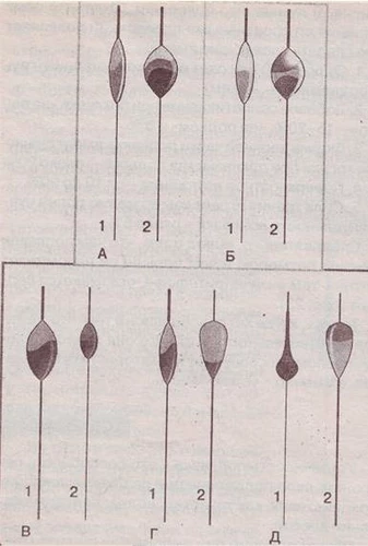 Рис. 11. Поведение поплавков с высоким Б и низким А расположением колечка Любимые мною поплавки, которые я чаще всего использую, можно увидеть на рисунке 12.