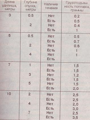 Данная таблица, конечно, не является полностью универсальной. Например, скорость течения на разных водоемах может быть весьма различной и от этого также зависит выбор грузоподъемности поплавка. Но даже этой таблицы будет достаточно для первоначального знакомства с поплавочной удочкой, а далее вы сами поймете, надо ли поставить поплавок побольше или, наоборот, снизить грузоподъемность оснастки. Выбор нескольких величин в таблице следует пояснить. Возьмем, например, удилище 10-метровой длины, глубина ловли 2 метра, течение отсутствует — в таблице вы можете увидеть цифру 2,5. А вот если мы посмотрим на цифру ниже (то же, но глубина ловли 4 метра), то рекомендуемая грузоподъемность поплавка будет 2 грамма. Непонятно? Незакономерно? На самом деле это связано с тем, что чем больше глубина ловли — тем легче забросить оснастку той же самой маховой удочкой, и выбор грузоподъемности тут обусловлен не глубиной ловли (скоростью погружения), а самой возможностью произвести заброс. Для глубины в 2 метра вполне достаточно поставить поплавок в 1 грамм, но забросить его удилищем 10-метровой длины практически невозможно. А вот если глубина будет метров 7, то мы легко забросим такой поплавок, но не сможем ловить. Вообще, на выбор грузоподъемности оснастки воздействие оказывают следующие факторы: • длина удилища — всегда чем она больше, тем больше грузоподъемность; (М. Балачевцев) | |