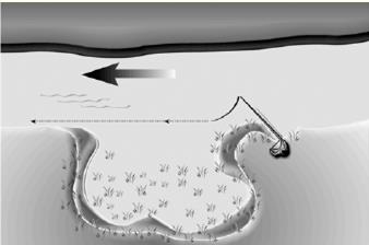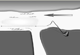 Рис. 2. Облавливается отмель ниже устья впадающего ручья или маленькой речки Размер крючка подбирается по размеру приманки. Весной это черви, личинки ручейника, мотыль, нимфы веснянки или стрекозы. Летом переходят на тесто, люпин, горох и прочие насадки растительного происхождения. Что касается прикормки, то при ловле весной многие рыболовы вообще ее не используют. И все же при ловле на течении она может сыграть положительную роль, так как в условиях плохой прозрачности воды она способна удержать некоторое время рыбу, которая в данный момент мигрирует согласно своим биологическим часам. Обычно в состав прикормки добавляют рубленого червя и большое количество крупных частиц (отруби, рис, пшеница). Ловят обычно на хорошо прогреваемых участках реки (рис. 1–3) на солнечной стороне. Обследуют все участки со спокойным «ленивым» течением и небольшой глубиной. Проводка весной выполняется у дна, а летом и осенью она ведется в полводы.