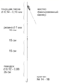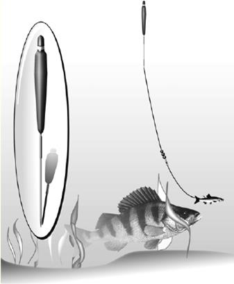 Рис. 6. Оснастка при ловле окуня на живца поплавочной удочкой Если вместо приманки применяют мальков, то грузоподъемность оснастки (не только поплавка) должна предусматривать размер живца, которого цепляют крючком за губы, под спинной плавник или хвост (рис. 6). Спуск поплавка устанавливают такой, чтобы наживка располагалась не более 1 м надо дном. При ловле на малька качественный вертлюжок перед поводком (не менее 30 см) обязателен. ЩукаЦеленаправленная ловля щуки на поплавочную снасть летом из-за низкой маневренности (в сравнении со спиннинговой ловлей) в настоящее время применяется нечасто. Однако с началом осеннего похолодания, когда рыба выбирает для своих стоянок глубокие места и нередко там группируется, имеет смысл заняться такой ловлей специально. Принципиальным отличием поплавочной снасти для ловли щуки, в сравнении с предыдущей, можно считать запас мощности. Поэтому в качестве удилища лучше выбрать спиннинговое среднего (medium) класса для заброса приманок весом до 42 г. Впрочем, подойдет и матчевое удилище длиной 3,6 м с тестовой характеристикой до 40 г. Катушка должна быть не столь скоростной, сколь мощной, с передаточным числом 4:1. Леска должна обладать разрывной нагрузкой не менее 2,5 кг. Так как в качестве наживки используются достаточно крупные живцы, а не мальки, а сама ловля производится в более глубоких местах, то и грузоподъемность поплавка и вес огрузки также должны быть больше. Поплавок по конструкции должен быть скользящим. Это обеспечит и более глубокий горизонт ловли, и дальние забросы. При наличие в водоеме щук весом более 5–6 кг следует подготовить металлические поводки. Если же известно, что размеры щуки ограничиваются 2–3 кг, то вполне достаточно поводка из кевлара длиной до 30 см, выдерживающего нагрузку не менее 5–6 кг на разрыв. В качестве наживки не обязательно, но желательно использовать рыбью молодь из того же водоема, где производится ловля. В стоячих водоемах это, прежде всего, мелкие плотвички, карасики, реже окуньки. Для ловли в реках, кроме упомянутых рыбок, часто используют мелких пескарей. Карасей и пескарей обычно зацепляют крючком подходящего размера за ноздри, а плотвичек и окуньков – за спинной плавник. При поклевке необходимо открыть лесоукладыватель и дать возможность щуке проглотить приманку. Обычно щука, схватив наживку, отходит, вероятно, по инерции на метр или два и, развернув жертву головой внутрь и извиваясь всем телом, заглатывает ее. Если живец велик для нее, то заглатывание может длиться минуту и более. Сигналом к подсечке будет сход лески со шпули, когда щука, проглотив наживку, начинает перемещаться. С открытым лесоукладывателем быстро отводим удилище назад и скидываем 2 м лески. Затем закрываем лесоукладыватель, выжидаем, когда провис лески уменьшится, и производим широкую, но плавную подсечку. Какой крючок использовать – обычный или тройник – зависит от степени рыболовного прессинга водоема. Если водоем посещается рыболовами нечасто и щука там не знакома с крючками, то имеет смысл использовать тройные крючки, которыми цепляется рыбка за хребет под спинным плавником или за кожу. Подсечка в этом случае производится моментально, в противном случае щука уколется и выплюнет и наживку, и крючок. Другие виды рыбНесомненно, что и остальные виды рыб также можно ловить поплавочной сн