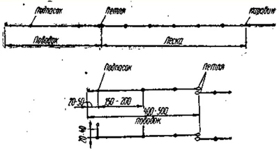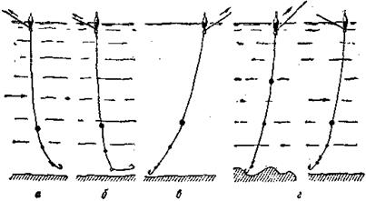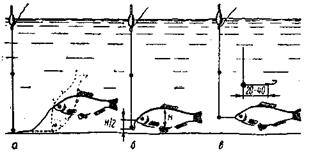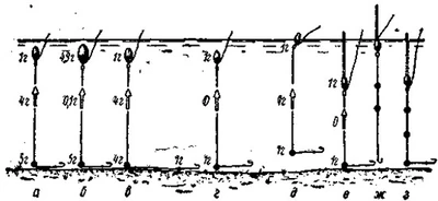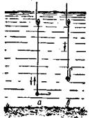 Рис. 7. Оснастка удочки для отвесной проводки При любой разновидности проводки важно подсечь, как только замечено необычное поведение поплавка, т. е. подчас еле различимая поклевка. Подсечка производится мягким (не резким), но упругим движением только кисти руки по кратчайшему направлению и не вверх, а в сторону, противоположную пути проплыва насадки. Такое движение вполне достаточно, чтобы заставить острый мелкий крючок впиться в покровы рта рыбы. Необычайно чувствительна оснастка, показанная на рис. 4, в, здесь поводок не гнется и поклевка передается сразу, как только рыба взяла насадку. Существует мнение, что. подводная часть лески проволочной удочки всегда кривая — изогнута так, как показано на рис. 6, г. Конечно, если представить, что эта часть находится в движущемся потоке, то увлекаемая водой и утяжеленная грузилами она должна занять положение, соответствующее скоростям потока на различных глубинах. В действительности леска займет такое положение только в том случае, если поплавок не придерживать. В принудительном движении в том же направлении, но в водоемах без течения (производимом силой тяги ветра или рыболовом) леска займет положение, показанное на рис. 6, в. Различные скорости водного потока по глубине характерны также и для распределения их по горизонтали: у берегов скорости пониженные, а в русле повышенные. Необходимо учитывать что движение частиц воды в реках и каналах не ламинарное — по параллельным линиям. Оно всегда турбулентное — вихревое. Поэтому положение лески в вода до некоторой степени условно, оно может изменяться в ту или иную сторону. Так же условна и механика взаимодействия рыбы с элементами оснащения удочки во время ее подсечки и вываживания в условиях статики, когда, например, считают, что рыба преодолевает только инерцию грузила и поплавка. В действительности же взаимодействие происходит в условиях динамики (подразумевается соотношение между путем, временем и массой для тел, находящихся в движении). Величину усилия, воспринимаемого эластичной леской и упругим удилищем, определяет равенство кинетической энергии (живой силы), развиваемой рыбой, импульсу ее силы, определяемой по формуле mw2/2 =ft, где т — масса тела, v — скорость, f — время, t — сила. Следовательно, усилие, воспринимаемое леской и удилищем, в большей степени зависит от скорости, развиваемой рыбой — пропорционально квадрату ее величины по сравнению с ее массой. Вот почему велика роль времени (в правой части формулы), в течение которого гасится рывок рыбы эластичной леской и изгибающимся удилищем, и чем больше время, в течение которого изгибается удилище, тем меньшее усилие оно воспринимает. Движением насадки надо управлять. Так, при ужении с берега после заброса она плывет вдоль берега. В конце проплыва задержанная натянувшейся леской насадка приподнимается от дна. В этот момент часто бывают поклевки — рыба берет ускользающую от нее наживку. Если поклевки не было, удилище поворачивают к берегу, чтобы насадка волочилась по дну. В этот момент также бывают поклевки. Затем насадку плавно перезабрасывают на прежнее место. При ужении с лодки или мыса эффективность ловли повышается, если уменьшается глубина в конце проплыва насадки и она начинает волочиться по дну. (И. Бухарой) | |