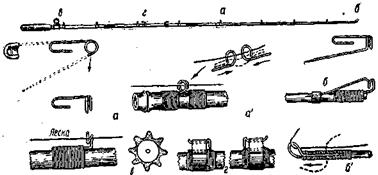 Рис. 1. Проводочное удилище: с — пропускные кольца, а' — менее надежный вариант кольца, б — концевое кольцо, б' — менее надежный вариант кольца, в — резиновое кольцо для барабана катушки, г — мотовильце Пропускные кольца. Если ловят с катушкой, на удилище крепят легкие кольца: концевое кольцо диаметром 3 мм, два верхних — 2 мм, два нижних (у комеля) —-5 мм, остальные — 3 и 4 мм. Обычные кольца неудобны: через них не проходит поплавок и грузила, их приходится снимать. Значительно удобнее разрезные кольца. Завести в них леску или снять ее можно быстро, не снимая грузил и поплавок. Наиболее простые кольца можно сделать самому из мелких булавок с диаметром спирали 3–4 мм (рис. 1, а, б). Они легкие и не ржавеют. У концевого кольца острие булавки не откусывают — оно служит запором, предотвращающим выскальзывание лески при забросах. После введения лески в кольцо на острие надвигают резиновое колечко. Разрезные кольца другой конструкции менее надежны (рис. 1, а1,б1), в особенности концевое: из него леска нередко выскальзывает, а при запирании резиновой трубочкой она защемляется между вершиной удилища и прилегающим к нему хвостом кольца. Кольца расставляют через каждые 20–30 см в верхнем конце и через 30–40 см в нижнем. Разрезные кольца следует поставить даже в том случае, если нет катушки. Они позволяют быстро укоротить или удлинить отпуск лески, сматывая или наматывая ее на мотовильце. КатушкаПри ужении в проводку катушка участия в забросе не принимает. Ее назначение облегчать изменение рабочей длины лески при забросе насадки и вываживании рыбы. Пользуясь катушкой, можно применять более тонкую леску. Катушка должна быть легкой, небольшого размера, вмещающей до 40 м тонкой лески. Проводочные катушки четырех моделей выпускает завод Военохот № 1. Катушка КПП-50 со стальным корпусом и пластмассовым барабаном ищет тормоз с трещоткой. Ее размеры: наружный диаметр барабана 50 мм, внутренний 30 мм, расстояние между щечками 10 мм. Катушка КПП-65 отличается от нее только размерами: наружный диаметр 65 мм, внутренний — 35 мм. Третья катушка отличается от предыдущей материалом. Она вся сделана из металла: корпус стальной или из дюралюминия, барабан дюралюминиевый. Есть в продаже катушка со стальным корпусом и пластмассовым барабаном (наружный диаметр 65 мм, внутренний 35 мм), ее конструкция аналогична катушке КПП-65. Отличие заключается лишь в способе крепления. Она имеет две щечки и барашек, с помощью которых крепится к удилищу. Но эта катушка тяжелее тех, которые крепятся кольцами, надвигаемыми на лапки стойки катушки. Намотанная на катушку леска не может укоротиться — и теряет прочность. Поэтому барабан катушки надо оклеить полоской губчатой резины, на которой нарезаны ребра (рис. 1,в). На барабан можно надеть тонкое резиновое кольцо, а к нему приклеить узкие резиновые ребра. Леска, намотанная на такую катушку, укорачивается без потери прочности. Высоту ребер определяют по формуле: h= ad/2, где h — высота ребра в мм; d — диаметр барабана катушки без ребер в мм; а — коэффициент удлинения лески. Так, при диаметре барабана 40 мм и удлинении лески на 20 % высота ребра составит; 0,20*40/2 =4 мм. МотовильцеЕсли нет катушки, для хранения лески ставят мотовильце — два крючка из латунной проволоки толщиной 1 мм. Их приматывают к удилищу прочной ниткой на клее БФ-2; расстояние между крючками 20–25 с