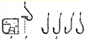 Рис. 3. Крючок для ужения в проводку: а — крючок № 4 с коротким цевьем, б — положение крючка при подсечке, в — глубина проникновения крючков (показана затемнением) в зависимости от их формы Имеет значение и изгиб поддева крючка. При подсечке он отклонится в сторону (рис. 3, б). При дальнейшем натяжении лески глубина проникновения крючка будет зависеть от формы поддева. На рис. 3, в затемнены части крючков, проникающие в рыбу. Крючок, показанный слева, проникнет наиболее глубоко — его форму следует считать лучшей. Остальные проникнут меньше, в том числе и показанный справа. Более грузоподъемным будет крючок, глубоко проникший в тело рыбы. Промышленность выпускает кованые крючки, у которых часть поддева с боков сплющена — это повышает их прочность при изгибе. Но такой крючок может перерезать губу рыбы или расширить место зацепления и выскользнуть из тонких и слабых покровов рта такой рыбы, как лещ или окунь. Предпочтительнее крючок с колечком: он лучше держится в узле. Его следует закреплять капелькой клея БФ-2. При ужении на живца применяют мелкие двойники и тройники. К ним предъявляют те же требования, что и к одинарным крючкам. ПоплавокОн — должен быть прочным, просто и надежно закрепляться на леске, легко передвигаться по ней, не намокать, не отпугивать рыбу блеском и яркой окраской, обладать наибольшей грузоподъемностью при возможно малом объеме и оказывать рыбе малое сопротивление. Решающее значение для ужения в проводку имеет чувствительность поплавка. Неплохим является поплавок из куги. Этот материал очень порист, объемный вес его незначителен, поэтому поплавок обладает большой грузоподъемностью и допускает большое огружение. В зависимости от глубины места ловли и скорости течения диаметр поплавка колеблется от 1 до 2 см, а длина от 5 до 8 см. Он завершается стерженьком толщиной 1,5–2 мм, высотой 1,5–2 см. Для крепления к леске в нижнюю часть поплавка заделывают «восьмерку» из двух спаянных проволочных колечек. Однако такой поплавок легко ломается, трескается и впитывает воду. Значительно лучше поплавок такой же формы, но пустотелый, из пластмассы. Но у такого поплавка есть недостаток: у него толстые стенки, поэтому он тяжеловат и малогрузоподъемен. С появлением пенопласта изменилась форма поплавка — его начали делать веретенообразным, удлиненным. Вместо «восьмерки» делают витой стерженек из мягкой проволоки толщиной 0,5 мм (лучше алюминиевый). Поплавок крепится к леске отрезком хлорвиниловой или резиновой трубочки. Так проще и надежнее, чем с помощью «восьмерки», на которой леска часто затягивается в тугой узел. Есть поплавок, у которого нижнему колечку «восьмерки» придана форма плечиков для хранения одежды, но и в этом случае тоже бывают узлы и поплавок сползает. Несколько хуже поплавок из пробки со стерженьком из птичьего пера — у него мала грузоподъемность при ловле на быстром течении. При ужении на волочащуюся насадку на очень быстром течении применяют поплавок с тупой вершинкой — его не затягивает под воду. Однако у такого поплавка понижена чувствительность. Если ловят на большой глубине, иногда применяют поплавок с зажимом: во время вываживания с помощью катушки поплавок упрется в концевое кольцо, леска выскользнет из него. Но для этого требуется большое усилие, а его можно приложить только при жесткой вершинке уди