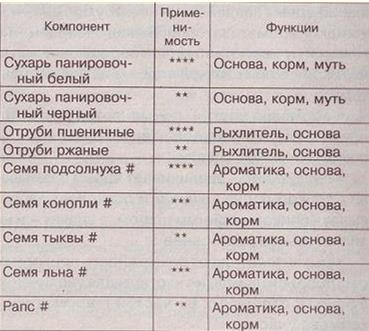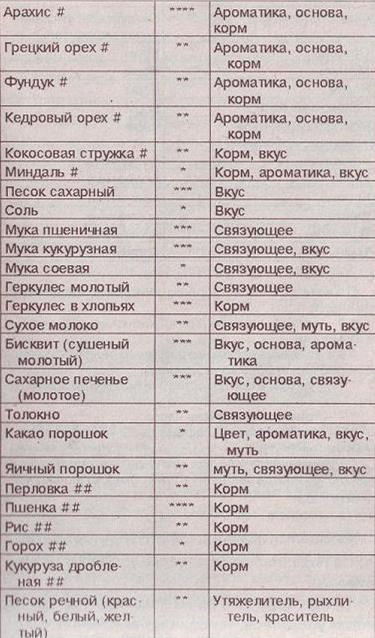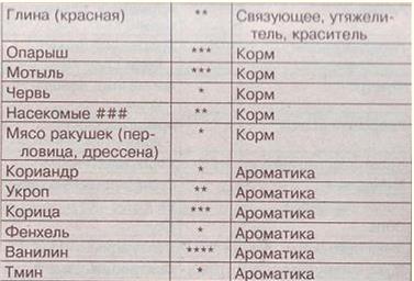 Таблица 1 Примечание: # — хорошо прожарить (как для еды) и промолоть; Различные функции одного и того же компонента перечислены в порядке убывания их значимости. Среди перечисленных компонентов, как вы могли убедиться, ни один не выполняет функции красителя и возбудителя аппетита. Эти функции обеспечивают только фирменные компоненты. Приготовить такой же в домашних условиях достаточно тяжело, да и не стоит потраченных усилий. Их добавление при любительской рыбалке редко когда оправдано. Из простейших же веществ, которые можно использовать в качестве красителя, можно назвать красную глину и красный песок, но эти компоненты, кроме того, имеют и другое назначение (связующее и рыхлитель соответственно) и, к тому же, достаточно объемны. Фирменные же красители не обладают ни вкусом, ни запахом и имеют очень малый объем, что практически не сказывается на свойствах самой прикормки. Из доступных красителей также можно взять набор для покраски яиц (так называемый «пасхальный набор»). Соотношение компонентов прикормкиВажным является не только то, какие компоненты входят в прикормку, но и в каком соотношении. Например, добавление в прикормку лишней капли концентрированной пищевой ароматической эссенции может привести к полному отсутствию клева на несколько часов. К таким компонентам, которые следует добавлять только в строго определенном количестве, кроме «ароматики» относятся еще и связующее с рыхлителями. Пропорции прикормок для различной ловли придут к вам с опытом, а пока я приведу примеры нескольких составов прикормок для любительской ловли, которые использую я (табл. 2–3). Данная прикормка применяется мной на большинстве водоемов, где я ловлю леща, язя и крупную плотву. При увеличении или уменьшении скорости течения можно изменять количество глины, т. е. если ваша прикормка размывается слишком быстро, то добавьте глины, а также молотого геркулеса или муки. Если глубина водоема большая (больше 5 метров), то рекомендуется добавить немного речного песка (не берите песок в городских песочницах, так как он может иметь неприятные для рыбы запахи из-за «деятельности» собак и кошек). При большом количестве рыбы в водоеме можно увеличить в объемном соотношении прикормки содержание более дешевой пшенной каши. Ни в этом, ни в следующем рецепте прикормки я не привожу такой компонент, как пищевая ароматическая эссенция. Делаю я это не для того, чтобы скрыть от вас свои секреты. Дело в том, что данные эссенции выпускаются в разных концентрациях, причем последняя не указывается на упаковке. Встретить эти эссенции можно только в Москве и Питере (причем, надо еще сильно поискать). Следовательно, если вы приобретете эти эссенции, то поэкспериментируйте сами. Ориентировочно могу сказать, что на 3 килограмма сухого веса прикормки надо добавлять примерно 0,1–0,6 миллилитра концентрата. Из тех эссенций, что использую я, могу перечислить следующие: «Ананас», «Клубника», «Малина», «Банан», «Яблоко», «Абрикос», «Персик», «Барбарис», «Груша». Экспериментируйте, смешивайте и удача вас не оставит. Таблица 2. Некрупная плотва, глубина до 2 метров, течение слабое А эта прикормка используется либо на мелких озерах, либо в маленьких заводях на реках. Если ваш водоем имеет большую скорость течения, то добавьте в этот состав муку и молотый геркулес (глина не рекоменд