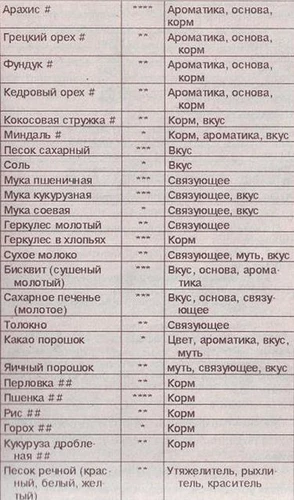 По оценкам рыболовов-спортсменов, успех ловли зависит на 50–80 % от прикормки. Во время соревнований рыболов-спортсмен использует, в среднем, около 5 кг сухого веса прикормки. Кроме того, состав спортивной прикормки очень сложен и в разных вариантах насчитывает около 10–30 компонентов. А вот на любительских рыбалках (вне соревнований) те же спортсмены используют более простые прикормки, состоящие из меньшего количества компонентов. Связано это с тем, что многие ингредиенты прикормки весьма дороги, а прирост улова они дают незначительный. На соревнованиях этот прирост, конечно, важен, а на любительской рыбалке им можно пренебречь. Кроме того, на любительской рыбалке практически нет конкурентов, поэтому использовать полноценную спортивную прикормку не имеет смысла. У каждого рыболова-спортсмена есть свои «секретные» компоненты, смеси и методы приготовления и использования прикормки и, разумеется, они не приводятся в этой книге. И все же разберем основные принципы приготовления и использования прикормки и дадим перечень большинства прикормочных компонентов и их назначение. Для любительской рыбалки этого более чем достаточно, а если вы решите заняться спортом, то со временем сами разработаете свои смеси и у вас появятся свои «секретные» компоненты. Еще одним фактором, влияющим на отличие спортивной прикормки от любительской, является то, что соревнования проходят на водоемах с определенными параметрами (ограничение по глубине, скорости течения и т. п.), а на любительской рыбалке вы можете попасть в какие угодно условия. Течение может быть настолько сильным, что ни одна спортивная прикормка не будет лежать на дне. На любительской рыбалке вас обычно не интересует мелочь, соответственно и прикормка не должна ее слишком интенсивно привлекать. Есть и еще несколько отличий спортивной прикормки от любительской, но об этом позже. Составные части (компоненты) прикормкиТеперь перейдем непосредственно к описанию принципов приготовления и использования прикормки. Прикорм состоит из следующих частей, каждая из которых имеет свое назначение: • основа — предназначена для доставки к месту ловли остальных компонентов. Обычно это низкокалорийная кормовая смесь со слабым вкусом и ароматом; • «ароматика» — служит для привлечения рыбы к месту ловли с помощью запаха. Ароматические добавки могут быть как порошковые, так и жидкие. Порошковая «ароматика» вымывается из общей массы прикормки медленнее, следовательно, интенсивность аромата меньше, но время воздействия на рыбу больше, чем у жидких ароматизаторов. Вывод очевиден — на течении лучше пользоваться порошковой «ароматикой», а при стоячей воде — жидкими добавками; • кормовая часть — применяется для остановки и удержания подошедшей рыбы в месте прикармливания (ловли); • связующее — увеличивает время размывания прикормки на течении и позволяет забрасывать прикорм единым шаром, а значит — и на значительное расстояние.; • рыхлители — дают возможность прикормке распадаться на мелкие частицы для увеличения эффекта отдельных ее частей («ароматики», кормовой части); • красители — придают прикормке привлекательный для рыбы цвет; • вкусовые добавки — используются для придания прикормке наиболее соблазнительного для конкретной рыбы вкуса; • утяжелители — с их помощью прикормка быст