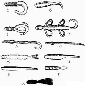 Рис. Основные разновидности приманок из мягкого пластика: а) простой твистер; Подводя некий промежуточный итог, замечу, что в нашей стране массовую известность имеет только одна «пассивная» джиговая приманка — это поролоновая рыбка. "Ничего не делающие" пластиковые рыбки, черви, слаги и т. п. пока остаются в тени, поэтому чуть позже я попытаюсь все-таки пробудить у читателей этой книги интерес к некоторым из приманок этого ряда. Общее предназначение и принцип работы той или иной приманки иногда теряются на фоне многочисленных малосущественных деталей. Если кто-то со мной не согласен и считает, что клев очень сильно зависит, к примеру, от особенностей геометрии твистера, то я не стану отвлекаться на затяжную полемику. Возможно, в отдельных случаях дополнительные хвостики и усики и провоцируют чуть больше поклевок, но главное в джиговых приманках, безусловно, не это. Так что не стоит растрачивать время на сравнительные испытания. Причем этот мой совет касается не только формы, но цвета. И не только твистеров, но и любых других спиннинговых приманок, даже не только джиговых. Всякий раз, когда я низвожу до одного из последних мест роль цвета приманки, то предвижу негативную реакцию большей части читателей. Ведь считалось и считается, что правильный выбор окраски способен творить чудеса. Во всех публикациях по спиннингу (особенно в рекламных) рекомендациям по подбору цветовой тональности отводится внушительная доля объема. По моему мнению, на цвет в гораздо большей мере обращает внимание рыболов, чем рыба, то есть выбор цвета приманки глубоко субъективен. Не буду повторяться и навязывать свое мнение. Если вам кажется, что в какой-то ситуации вы наловите, скажем, на зеленый с блестками твистер больше рыбы, чем на любой другой — ради Бога. Но обзванивать рыболовные магазины в поисках твистеров нужной расцветки я уж точно не советую. В известной пословице цвет упоминается в связке со вкусом. Приманки из мягкого пластика отличаются от большинства других как раз тем, что имеют не только широкую цветовую гамму, но и разнообразные вкусовые добавки. И я склоняюсь к выводу, что, в отличие от цвета, правильный выбор вкусового аттрактанта способен заметно активизировать клев. Вопрос об ароматизированных приманках слишком сложен, чтобы ограничиться одним мимолетным замечанием. Наше нынешнее представление о них не намного отличается от взглядов спиннингистов середины века. В те годы отдельные пытливые экспериментаторы прикрепляли к блеснам что-то наподобие пропитанного рыбьим жиром тампона, а потом, как правило, приходили к заключению, что заметного эффекта это не дает. Тем временем мировая рыболовная индустрия уже выпускала вкусовые аттрактанты, в том числе и те, что были рассчитаны на хищную рыбу. Позже, с появлением мягких пластиковых приманок, появилась возможность внедрять ароматизирующие вещества в структуру пластика на молекулярном уровне. По своему составу аттрактанты, хотя они и отдают большей частью все тем же банальным рыбьим жиром, могут быть весьма сложными и разнообразными. Их можно разделить на два типа — на универсальные, которые призваны улучшить клев любой рыбы, и на специальные, нацеленные на хищника совершенно конкретного вида. Последние считаются наиболее действенными. Проблема заключается в том, что с самого нача