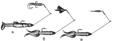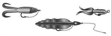 Рис. 3. Легкие незацепляющиеся оснастки для ловли в сплошных зарослях травы. Моими любимыми насадками и здесь являются двухвостые твистеры, а для крупной щуки — натуральные имитации лягушки, например модель “Banjo Frog”. Неплохо зарекомендовал себя и “листок”, напоминающий умирающую или больную рыбку на поверхности воды (рис. 3). Перечисленные приманки обладают заметной игрой даже на самой медленной проводке. Но когда хищник активен, можно использовать ускоренную проводку и “скользящие” приманки без особой игры в форме червей и рыбок. Мне лично больше импонируют варианты с горизонтальным расположением хвостика, например, модели “Shadow” и “Fin-S” (рис. 4).