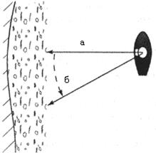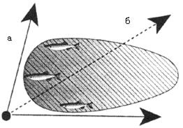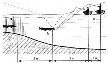 Рис. 11. Облавливание границы водорослей: а) перпендикулярный заброс; б) заброс под углом. При забросах к траве всегда встает вопрос, насколько близко можно подплывать, чтобы стоящая в зарослях рыба не насторожилась (естественно, что вести себя следует как можно тише). Вспомним ихтиологию: все надводные предметы рыба видит под определенным углом (примерно 100°), как бы в расширяющемся секторе (рис. 12). В стороны от этого “окошка” она замечает только подводные предметы. Следовательно, сидящего или стоящего в лодке рыболова рыба может видеть не дальше определенного расстояния. Например, для щуки на глубине 1 м это расстояние составит 5 — 7 м. Добавим 5 м на преследование и поклевку (а большинство поклевок происходит как раз на таком расстоянии, хотя нередко хищник провожает приманку до самой лодки), да еще 5 м “на всякий пожарный” и получим минимальное расстояние до рыбы в 15 м, которого лично я всегда и придерживаюсь на рыбалке.