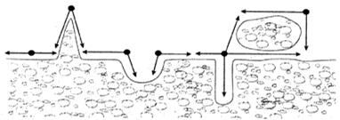 Рис. 19. Распределение глубин в яме. Где встречаются ямы? Есть несколько характерных мест (рис. 16в, г, д), хотя следует помнить, что встречаются “нестандартные” ямы” которые трудно предугадать, а можно только обнаружить и запомнить. Мы уже знаем, что до и после переката (и прочих сужений) есть входная и выходная ямка. Другой часто встречающийся случай — яма на резком повороте реки, где струя бьет в противоположный берег, вымывая под ним глубокий омут, который очень любят все рыбы. Основной ориентир — обрывистый берег. Чем он круче, тем больше глубина у этого берега, тем больше вероятность глубокой ямы. Ее можно “предсказать” и по поверхности воды: если течение неровное, есть завихрения, водовороты, “обратка” — это также признаки ямы. Как ловить на яме? Дело в том, что эта ловля имеет свои особенности. В самой яме хищник отдыхает и, чтобы спровоцировать его на хватку, нужно попасть ему “по носу”, да еще сымитировать сильно ослабленную добычу. Отсюда вывод: перспективную яму надо тщательно “прочесать” в разных направлениях, а приманка должна быть достаточно большой (большому куску рот радуется, да и хищник в яме стоит самый крупный) и самой легкоиграющей, чтобы осуществить медленную ступенчатую проводку. Особенно подойдут большие твистер, виброхвост и “осьминог”. Когда рыба заторможена, могут выручить “вялые” пассивные приманки: “большой червь”, “кальмар”, поролоновая рыбка. Лучшие цвета в глубокой яме — светлые и “подсвечивающие”: святящийся, флуоресцентно-желтый, лимонный, молочно-белый и желтый, а также яркие “кислотники” — зеленый и красный. Груз-головка должна быть по возможности легкой (самой легкой среди самых тяжелых), чтобы приманка падала помедленнее, но при этом оставался бы нужный контакт с ней. Хороши “стоячие” головки: “сапожок”, “подкова”, и т. п., которые можно проводить с остановками, разрешая им некоторое время постоять на дне. Течение в яме сложное, вихревое, у самого дна — слабое, а так как глубина приличная, то леска может заметно изгибаться. Значит, она должна быть как можно тоньше — лучше всего подойдет плетеная. Но чаще поклевки происходят не в самой яме, а в районе бровки, куда хищник выходит на охоту. Именно по свалам и производится основная ловля. Здесь возможны два варианта: облов по краям ямы и ловля через яму (рис. 20).