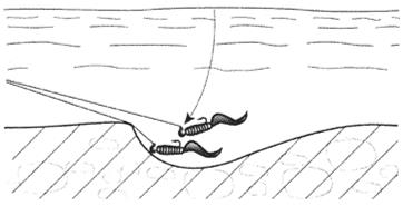 Рис. 21. Переход приманки через бровку: а) с задеванием; 6) без задевания. Здесь желательно, примерно представив верхнюю бровку, попытаться перевалить через нее, как самолет перелетает через гору. Самый простой способ: забросить чуть дальше, опустить приманку на нужную глубину (считая про себя) и провести ее над свалом равномерной или волнистой проводкой — обычно для щуки этого достаточно. Если кромка цепляется, то начинать подмотку следует еще раньше (считайте). А если получится положить приманку точно на верхнюю бровку и 5 — 10 м осуществить “ступеньку”, то это будет неотразимо для судака, окуня, да и щуки тоже. Но здесь, в проводке над свалом есть свой “цветной” нюанс, ведь хищник видит силуэт нашей приманки снизу, на фоне светлого неба и водной поверхности. Поэтому, особенно при солнце и ряби, когда все бликует и пестрит, светлая приманка может “потеряться” в этом блестящем пространстве. Взгляните на небо, когда по нему несутся мелкие облака и ярко светит солнце — какой самолет вы быстрее увидите, светлый или темный? Так и здесь — выигрышной окажется приманка темного цвета (черного, коричневого, красного) и большего размера. Если же мы ловим через яму, то на подходе к ближнему краю приманку нужно поднять быстрым вращением катушки и удилищем и провести над верхней бровкой без задевания. В любом случае полезно в рабочей зоне сделать несколько легких рывков, чтобы привлечь внимание к “жертве” и сымитировать ослабленную рыбку — простую добычу для хищника. Пройдя бровку и контрольные 10 м за ней, можно просто вытаскивать приманку — поклевки вдали от свала довольно редки. (В. Андреев) | |