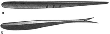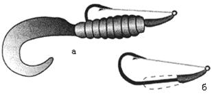 Рис. 4. “Скользящие” пассивные приманки в незацепляющейся оснастке для ловли в траве: a) “Slug-go”; б) “Fin — S”. Здесь следует вспомнить “банджо-гольяна” на незацепляющейся “передней” оснастке. Густые травянистые заросли как раз для него. Особенно хорошо “гольян” работает в небольших окнах среди травы. Эта приманка натуральной формы тонет очень медленно и максимально возможное время находится в поле зрения хищника, при этом ей можно рывками имитировать судороги. Редко какая щука может пропустить такое зрелище! Недостатком является малый вес и то, что одинарный крючок находится впереди рыбки и не всегда засекает хищника, а сама приманка быстро “размочаливается” или безнаказанно сдергивается щукой. Можно снизить этот отрицательный эффект, если к ушку крючка привязать несколько красных шерстинок (имитация мотыля) — как будто рыбка собирает плавающих червячков. После такой добавки мне показалось, что щука стала брать вернее, стремясь схватить и рыбку, и мотыля, а также заметно выросло число окуневых поклевок, т. к. полосатые всегда готовы утащить добычу у собрата, даже из пасти (рис. 5).