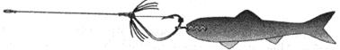 Рис. 6. Незацепляющаяся оснастка “осьминога” тройником с предохранителем. Если вы попробуете ловить на “осьминога”, то сразу увидите, что он дает заметную игру лишь при неравномерной проводке, с рывками и паузами. Тогда щупальца то сжимаются, то расправляются, провоцируя хищников на атаку. Неплохой эффект могут дать и поролоновые приманки, которые в силу мягкости материала легче сделать незацепляющимися (рис. 7). “Поролонку” нетрудно смастерить самому: спрятать внутри нее крючок, при необходимости — подгрузок, а также скомбинировать поролон с нитками, резинками и т. п.
