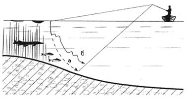 Рис. 10. Ловля на падающую приманку вдоль границы водорослей: а) равномерное падение; б) падение с рывками. В таких случаях, если с лодки, поставленной недалеко, подбросить легкую приманку к самому краю водорослей и держать ее на натянутой леске, то она будет сравнительно медленно падать по дуге под самым носом щук и окуней. Такой способ, без проводки как таковой, а только со свободным падением, здесь может оказаться оптимальным. Во время падения полезно оживлять игру приманки коротенькими подергиваниями. Чтобы она находилась поближе к траве, можно забрасывать не перпендикулярно к краю водорослей, а под углом (рис. 11). Незацепляющуюся приманку можно “положить” и в самые заросли.