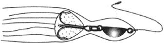 Рис. 5. Оснастка типа “банджо-гольян” с кисточкой ниток на крючке. “Банджо — гольян” — одна из лучших спиннинговых приманок, когда медленная проводка должна иметь значительную вертикальную составляющую, т. е. когда горизонтальное перемещение чередуется со свободными падениями. Именно падающую приманку хищник обычно берет с головы, поэтому надежнее садится на носовой крючок. Причем оснастка в принципе применима не только к родному “гольяну”, но и к любым подходящим твистерам и виброхвостам. И наконец, приманка “осьминог” (“октопус”), как оказалось, вполне подходит для ловли в зарослях. “Осьминог” хорош тем, что его обтекаемая форма помогает “проскакивать” траву, а внутренняя полость дает возможность спрятать там груз и даже небольшой тройник, который до некоторой степени защищен щупальцами. При хватке хищника щупальца сжимаются и крючок зацепляет добычу. Для солидной щуки приходится ставить крупный тройник, выступающий за габариты “осьминога”, и здесь крючок приходится защищать. Я, например, использую поролоновую каплю на тройнике или защитные петельки, а также ставлю небольшой эксцентричный груз, чтобы приманка не вращалась (рис. 6).