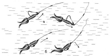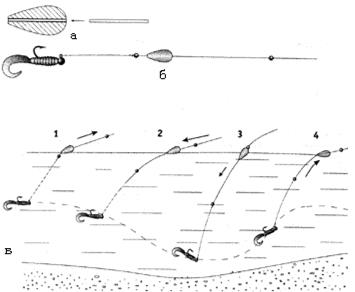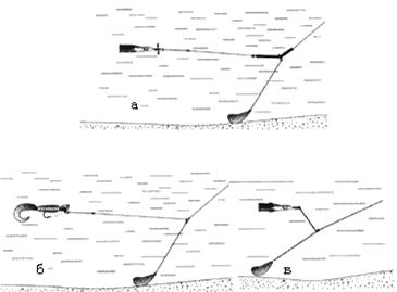 Рис. 13. Варианты оснасток для ловли вдоль границы водорослей против течения: а) “выталкивающая” джиг-головка; б) подгруженный крючок. И наконец, в таких условиях можно успешно использовать оснастки с концевым грузом (рис. 14), особенно там, где не мешает донная трава.