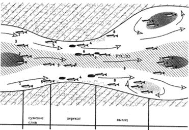 Рис. 17. Схема переката и расположение рыбы. Ловля на перекате универсальна — сочетание струи и затишья, мели и глубины, дает возможность поймать практически любую рыбу (щука, судак, окунь, жерех, сом, язь и голавль, а на севере — семга, кумжа, форель, хариус и сиг). Дело в том, что хорошо освещенные, прогреваемые солнцем перекаты со свежей проточной водой и укрытиями из камней служат идеальным местом для развития насекомых и их личинок. На этот корм выходит малек и более крупная “мирная” рыба, а за ними — хищники. Рассмотрим основные стоянки рыбы. Перед сливом в перекат профиль реки сужается, глубина уменьшается, а течение увеличивается. Окунь и щука стоят обычно в прибрежной зоне, где течение еще не велико (точка 1), судак — глубже, в русле, на выходе из ямы и по бровкам (точки 2, 3). На самом перекате хозяйничают жерех и голавль. У берега в замедленной вихревой зоне всегда много малька, там охотятся небольшие жерехи и голавли (точка 4). Крупные рыбины стоят глубже, на быстром течении, причем если жерех охотится в поиске, как правило, по границе струи (точка 5), то голавль предпочитает засаду, т. е. стоит за каким-то препятствием, особенно любит крупные камни (точка 6). Перекат заканчивается выходной струёй и этот участок является самым интересным для рыболовов. Из-за сильного течения на струе многим рыбам удержаться трудно, и они предпочитают более тихие участки, на перекат же выходят только кормиться. Поэтому лучшие места — это начало выходной ямы (точка 7) и боковые “карманы” с обратным течением (точка 8). Здесь у хищников очень выгодная позиция: замедленное течение, хорошая видимость и близость к струе, несущей разнообразный корм. И каждая рыба занимает здесь свою нишу. На струе охотятся: вверху — жерех, внизу — голавль, т. к. они наиболее приспособлены к быстрому течению. Из ямы совершают набеги на отмели и русло судак, сом, крупная щука, окунь и язь. Очень интересны и боковые “карманы” с обратным течением, где “пасутся” некрупные щучки, окуни и язики. Здесь же на самой границе, но ближе к быстрине часто стоит и голавль (точка 9). Если место не беспокойное, сюда могут выйти из глубины сомы, судаки, щуки и окуни, особенно на зорях и ночью. Рыба обычно концентрируется в начале “кармана”, на границе прямого и обратного течения, хотя и ниже тоже нередко встречается. Особо следует сказать о ночной ловле на перекатах, которая весьма романтична и добычлива. Основной объект ловли — судак, изредка попадается голавль, щука, налим, сом. Способов ловли два: по дну и по поверхности. Ловля понизу имеет свои особенности: быстрое течение, небольшая глубина и каменистое зацепистое дно отдают предпочтение легким джиг-головкам проскакивающего типа “банан”, “ложка” желательно в незацепляющемся варианте. Можно применять и небольшие коромысла с нижним грузом. Сильное течение заставляет выбирать приманки, играющие не слишком активно. Часто обычные твистеры и виброхвосты приходится подрезать или даже использовать пассивные варианты: “кальмаров”, поролон, пассивную резину, которые, однако, при правильной проводке на течении дают необходимую игру. В условиях ночной ловли со дна наиболее удачны светящиеся приманки — это основной цвет. Годятся также флуоресцирующие (подсвечивающие), в крайнем случае — просто белые или желтые. Днем на хорошо освещенных перекатах, н