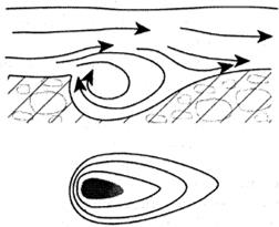 Рис. 18. Позиция хищника относительно солнца: а) выгодная; б) невыгодная. Из этого же рисунка видно, что хищник, стоящий в береговой траве справа, имеет лучшую позицию, чем стоящий слева, т. к. сам “маскируется” в тени водорослей, и солнечный свет не мешает, а помогает ему в наблюдении за окружающей обстановкой. Влияние солнечного света не стоит слишком переоценивать, оно заметно при чистом небе, ярком солнце, на небольшой глубине и в тихую безветренную погоду. В других случаях (ветер, облака, глубина и т. п.) влияние солнца значительно снижается. 5. У хищника больше шансов остаться незамеченным, если он подкрадывается к добыче сзади, а так как мелочь в основном стоит головой против течения, то и хищник должен атаковать сзади тоже против течения. Согласно этим правилам, ваши уловы будут максимальными, если вы: 1. Облавливаете яму с той стороны, которая граничит с местом кормежки хищника: перекатом, отмелью, заливом и т. п. 2. Выбираете такое место, где заброс выполняется против солнца, а приманка проводится чуть выше по течению от засады хищника. 3. Запоминаете время наилучшего клева. Велика вероятность, что в это время для хищника под водой оптимальные условия освещенности, поэтому в следующие разы он выйдет на охоту в то же самое (или близкое) время. В большинстве случаев яма на течении имеет неравномерную глубину (рис. 19). Верхний по течению склон обрывистый, так как его край заносит донными осадками, а под ним образуется зона завихрений, которая вымывает ямку (как за камнем). Боковые склоны ямы уже менее крутые, а задний — самый ровный и пологий. Поэтому, если в самой яме нет укрытий (коряг, топляков и т. п.), то рыба, а значит и хищник, будет держаться в основном под передним склоном, гораздо реже — у боковых и совсем редко — на заднем склоне.