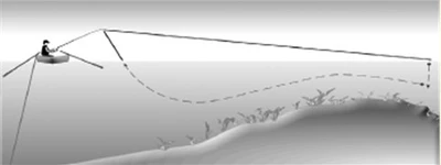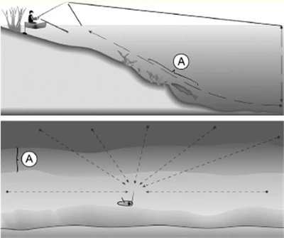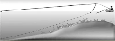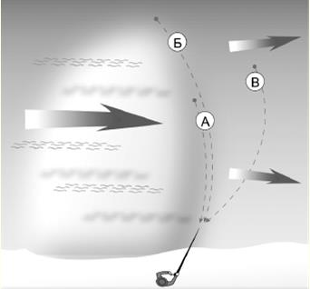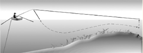 Рис. 7. Схема ловли судака с дамбы При ловле в зонах а и б наиболее выгодной тактикой будет волочение твистера по дну, когда он только на какие-то мгновения утрачивает контакт со дном. При этом создается впечатление, что приманка «пропахивает» дно. Такое волочение должно сменяться паузами. Судак редко остается равнодушным к едва перемещающемуся объекту. В любом случае, даже если и происходит отрыв приманки ото дна, то он должен быть мягким. Резкий «прыжок» приманки может спровоцировать к атаке окуня, а судака, напротив, отпугнуть. В случаях, когда такая ловля приводит к слишком большой потере приманок в результате множественных зацепов, можно попытаться использовать более легкую джиг-головку так, чтобы при аналогичной скорости проводки приманка только периодически касалась дна. Атака судака весьма характерная. Рыба, преследуя приманку, «обнюхивает» ее и нежно покусывает за мягкий вибрирующий хвост риппера. Такие поклевки можно заметить только на удилище с мягкой вершинкой. Вообще следует отметить, что мягкие приманки для ловли этого вида рыб намного предпочтительнее, нежели блесны, воблеры и пр., которые он распознает достаточно легко и во второй раз уже не атакует. При своевременно произведенной подсечке крупного судака вначале создается впечатление «мертвого» зацепа. Затем рыба начинает упираться, подобно крупному окуню, но сдается достаточно быстро, поэтому вываживание должно быть скорее силовым, тем более, что часто она засекается не глубоко. Судака можно обнаружить и в районе каменных насыпей. Их производят для укрепления берегов, которые подмываются течением. Именно в таких местах судак и находит себе укрытия, тем более, что, как правило, здесь же укрывается и молодь уклейки, леща, окуня, плотвы и пр. Надо сказать, что такие участки спиннингисты часто обходят, так как ловля на них чревата большими потерями и нередко улов не перекрывает тех средств, которые были затрачены на оставшиеся на дне, в камнях, приманки. Тем не менее, если ваш опыт позволяет определить, где находится приманка в любой момент проводки, то потери станут значительно менее весомыми. Иначе говоря, вы сможете вовремя оторвать приманку со дна и на высокой скорости вывести ее для последующего заброса. Гораздо меньше потерь приманок случается при ловле с берега, укрепленного бетонными плитами. Но и рыбы там намного меньше. Конечно же, судака ловят и в других местах. Это прибрежные отмели с выраженным свалом в глубину, каменистые подводные гряды, глубокие перекаты с хрящеватым дном, а также мысы, создающие отбойные струи, вымывающие дно. ВодохранилищаПри поиске судака на водохранилище нельзя ориентироваться по характеру береговой линии, как на реке. Единственное, что возможно, это сопоставление информации, полученной от знающих водоем рыболовов или местных жителей с результатами самостоятельного обследования дна водоема. При этом нам потребуется определить участки с твердым, не заиленным дном, что хотя и обременительно, но возможно сделать экспериментально с помощью глубомера, скажем, 0,5 кг весом. Желательно уточнить места, где до затопления росли деревья, были мелкие озера, ставы и старые русла, проходили дороги или находились какие-то строения. Ну и конечно, важно определить место прохождения русла реки. Намного быстрее, нежели глубомером, обследует