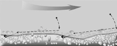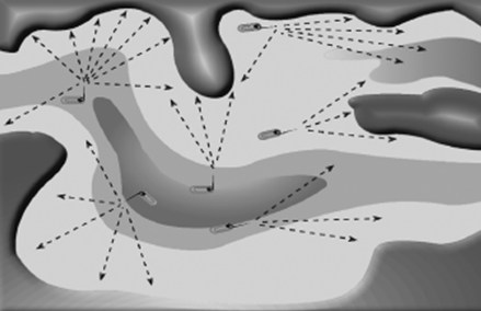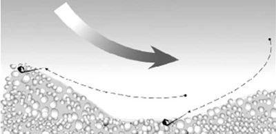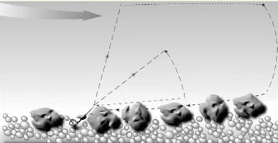 Рис. 10. Схема забросов при ловле жереха с дамбы Следуя правилу, как можно меньше перемещаться, дабы не вспугнуть добычу, с этого же места можно попробовать еще раз обловить ту перспективную струю, которая в результате отражения от вершины дамбы направляется наискосок вниз по течению. Обычно приманка забрасывается поперек течения, после чего выжидается время, чтобы она в результате проводки на снос подошла в необходимое место (рис. 10, б). Какое-то время стоит еще выждать, пока она работает за счет напора воды, а затем можно медленно подтягивать. Наиболее часто атака наступает тогда, когда приманка «входит» в струю. Значительно сложнее поймать жереха, когда он жирует в спокойной (рис. 10, г) воде, так как места его атак постоянно меняются. При ловле жереха в большинстве случаев приходится вести приманку в верхних слоях воды, поэтому спиннинг лучше выбирать подлиннее (около 3 м), а при условии применения мелкой приманки с небольшим крючком вершинка удилища должна быть относительно мягкой. В случае же использования больших и тяжелых приманок для ловли на больших дистанциях спиннинг, конечно же, должен быть более жестким. Жереховые приманки – это чаще всего тяжелые, узкие, практически не профилированные колебалки оттенка нержавеющей стали или потемневшего серебра, разрешающие выполнять предельно дальние забросы. К другим жереховым приманкам, позволяющим ловлю на большом расстоянии, можно отнести рипперы и твистеры жемчужного оттенка с черной или голубой спинкой, оснащенные тяжелыми головками. При ловле в достаточно прозрачной воде отличный результат показывают прозрачные силиконовые приманки. Если позволяют условия, я имею в виду наличие естественных укрытий для рыболова, таких, как кусты или высокая трава, то к жереху стоит подкрасться с легкой приманкой, тем более, что и выполнить заброс в указанную точку будет гораздо проще. Из таких приманок я бы выделил легкую колеблющуюся блесну (4–6 см), небольшие плавающие воблеры (3–7 см) с довольно активной игрой и легкие вращающиеся блесны с малым углом отклонения лепестка от оси блесны. Эти приманки бывают достаточно уловистыми тогда, когда жерех почему-то не реагирует на описанные выше. Атака жирующего жереха настолько мощна, что нередко появляется ощущение, что еще чуть-чуть и спиннинг вылетит из рук. Скорее всего, именно это и привлекает в ловле жереха. Береговые каменисто-галечные насыпи, вдоль которых проходит струя быстрой воды, тоже могут принести удачу при охоте за жерехом, тем более, что глубина здесь намного более выражена. Такие участки надлежит облавливать, спускаясь вниз по течению реки (рис. 11) и тщательнейшим образом соблюдая условия маскировки. Но в воду при такой ловле лучше не входить, так как взмученная ногами, она, достигнув стоянки рыбы, может вспугнуть добычу. Легкая вращающаяся блесна с узким лепестком, маленькая колебалка или такой же небольшой воблер забрасываются вниз и чуть наискосок по течению, которое, выравнивая леску, относит приманку к берегу. Проводка производится достаточно медленно и у самой поверхности воды. Атака рыбы при такой ловле, если она не жирует, мало похожа на ее поклевку на течении. Рис. 11. Схема забросов при ловле жереха с берега Жерех нередко охотится и у крутых, обрывистых берегов с глинистой или песчаной почвой при условии наличия там дос