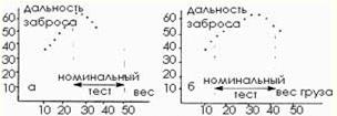 Рис. 2. Результат тестирования спиннинговых удилищ: а) номинальный тест отличен от реального; б) номинальный и реальный тесты совпадают Другой пример (рис. 2б) — это один из спиннингов Lamiglas — как типичное воплощение американской концепции. Здесь номинальный (весьма узкий, что тоже типично) тестовый диапазон и фактический почти совпали: самый дальнобойный вес оказался где-то между серединой и верхней границей диапазона, и запас прочности явно позволял забрасывать вес, равный этой самой границе. Это позволяет обоснованно предположить, что это, как и многие другие американские удилища среднего и дорогого класса, и в самом деле тестируются, то есть подвергаются примерно таким же испытаниям, которые мы сейчас описали. Стало быть, словосочетание "Test Weight" ("тестовый вес") в данном случае можно понимать буквально. Попробуем копнуть чуть глубже и ответить на вопрос, только ли поведением удилища в момент заброса ограничивается наш интерес к его тестовому интервалу? Во всех прочих случаях это, возможно, и так, но в джиг-спиннинге не менее важно поведение удилища во время проводки, и когда мы оцениваем джиговую приманку на предмет соответствия ее веса тесту удилища, мы тем самым говорим о том, хорошо ли этим удилищем ощущается проводка приманки. Это значит, что помимо теста по забросу, должен еще быть и тест по чувствительности. В идеале одно с другим должно совпадать, но на практике такое бывает редко. Объясняется все довольно просто: если зависимость дальности от веса приманки имеет выраженный экстремум (максимум), то аналогичная зависимость чувствительности — это монотонно возрастающая функция, то есть чем выше вес приманки, тем лучше чувствуется ее проводка. Наиболее дальнобойный вес будет ощущаться при проводке похуже, чем вес, несколько более тяжелый, поэтому иногда приходится даже немного поступиться дальностью заброса ради лучшего восприятия проводки. Более того, с этой целью в определенных ситуациях допустимо превысить верхнюю границу интервала веса приманки (то самое исключение, о котором я упоминал выше), но при этом заброс выполняется очень аккуратно — без претензий на дальность и без особых перегрузок спиннинга. Теперь, я думаю, можно в определенной мере понять, что имеется в виду, когда на некоторых спиннингах специального назначения указывается заведомо, вроде бы, завышенный тестовый диапазон. Так, начертанные на «Спайдере» 20–80 г — это, скорее, тест по чувствительности, а не по забросу. Реально этим удилищем можно в силовом стиле (как мы, собственно, и привыкли) бросать приманку весом граммов до тридцати пяти, а самый дальнобойный вес — я специально не испытывал, но могу предположить — не превышает тридцати. Однако заметим, что «Спайдер» — это «палка» для мертвой рыбки, и потому на предельно резкий силовой заброс она, по замыслу, и не должна быть рассчитана. Если же работать ею в более мягком стиле, то, очевидно, можно бросать и 50-граммовые, и более тяжелые головки — их проводка будет восприниматься очень отчетливо. Там, где большая глубина сочетается с сильным течением, такое себя оправдывает — в наших условиях это, к примеру, наблюдается при ловле судака и сома в низовьях Волги. Общий отсюда вывод такой: когда мы подбираем спиннинговое удилище и пытаемся понять, в какой мере можно доверять указанному на нем тестовому инте