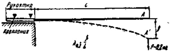 Рис. 2. Определение упругости удилища Разные материалы имеют разную степень упругости. Упругость бамбука, идущего на изготовление удилищ, зависит от породы, влажности и зрелости его. Сейчас лучшим материалом для удилищ следует признать стеклопластик, основой которого является стекловолокно, а связующим — полиамидные смолы. Измеряют упругость удилища величиной деформации, оставшейся после его изгиба (рис. 2). Для этого удилище ставят под углом 45° к горизонтали, закрепляют нижнюю часть рукоятки, а конец нагружают так, чтобы он опустился до горизонтали. Через 3–4 мин. груз снимают. Если после освобождения от нагрузки удилище остается короткое время изогнутым, а затем выпрямляется, оно имеет временную (исчезающую) деформацию. Если с течением времени удилище полностью не разгибается, значит оно имеет остаточную деформацию. У хороших удилищ этого не должно быть. Этим недостатком страдают удилища, изготовленные из незрелого бамбука. Исчисляют деформацию в процентах. Точка Л — конец удилища до испытания, точка С — после испытания. Длину отрезка АС делят на высоту АБ и умножают на 100. Исчезающая деформация обычно не превышает 3 %. Жесткость удилищаЭто понятие часто путают с упругостью. Жесткое удилище сгибается с усилием, а упругое, если оно не жесткое, изгибается легко, без особых усилий. Если на концы удилищ равной длины подвесить равные грузы, то более жесткое удилище даст на конце меньшую стрелу прогиба. Рис. 3. Определение жесткости удилища Жесткость удилища любой длины можно определить отношением стрелы прогиба его конца в сантиметрах к его длине в метрах, подвешивая на конце один и тот же груз Р=0,2 кг. Для определения жесткости удилища его рукоятку целиком кладут на твердое горизонтальное основание (рис. 3), например на стол, и закрепляют в двух точках. Свисающую часть измеряют в метрах и засекают на вертикальной рейке высоту конца удилища А над полом. На конец удилища вешают груз Р=0,2 кг. Конец удилища переместится в точку А, тогда измеряют величину f стрелы прогиба в сантиметрах. Жесткость (В основу расчета положено отношение стрелы прогиба f к изгибающему моменту M — PL в килограммометрах. Поскольку Р — =0,2 кг величина постоянная, то она исключается из расчета.) Л0j2 = f/L. При длине удилища (без рукоятки) L — 1,5 м и грузе Р — 0,2 кг стрела провеса на конце f= = 24 см. Жесткость удилища Л0,2 = 24: 1,5=16, Чем меньше величина А., тем жестче удилище.