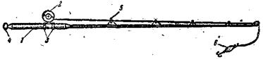 Рис. 1. Спиннинговая снасть: 1 — рукоятка удилища, 2 — катушка с леской, 3 — катушкодержатель, 4 — грибок, 5 — пропускное кольцо, 6 — блесна Упругость и жесткость удилища можно измерять и выражать числовыми величинами. Обе эти величины, вместе взятые, характеризуют мощность удилища, что имеет большое практическое значение. Чем больше мощность удилища, тем более крупную рыбу оно вываживает, тем более тяжелый груз метает. Для каждого удилища существует свой определенный груз, который оно способно метать (без перегрузки) на более дальние дистанции. Его необходимо знать каждому спиннингисту, а для этого надо знать жесткость удилища. Жесткое, но не упругое удилище, которое сгибается с большим усилием, а затем не выпрямляется, нельзя считать мощным. — Качество удилища во многом зависит от его строя, т. е. от формы и размеров. Кроме того, удилище должно быть легким, так как во время ловли его держат в руках. Легкое удилище меньше утомляет рыболова и более маневренно. Упругость удилищаИтак, чтобы иметь полное представление об удилище, необходимо знать его техническую характеристику, а именно — данные о его упругости, жесткости, мощности, строе (форма и размеры) и весе. Без этих данных судить о качестве удилища нельзя.