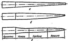 Рис. 5. Различные формы удилищ: а — конусная, б — параболическая, в — конусно-параболическая Как отражается сгон на строе удилища? Сравнивая два удилища одинаковой длины с равными диаметрами вершин, но разными комелями, мы убеждаемся, что комелистое удилище (с более толстым комелем) ощущается в руке собранно, цельно, т. е. чувствуется все — от комеля до вершины. Оно послушно, легко управляемо, так как имеет благоприятный баланс (центр тяжести расположен ближе к комелю, к руке). Удилище с тонким комелем менее собранно, трудно управляемо. При подсечке рыбы оно «клюет» вершиной и, следовательно, запаздывает, баланс его неудовлетворительный и поэтому рука ощущает его как тяжелое. Вместе с тем у прогонистого удилища есть свои преимущества. При забросе грузила и вываживании рыбы оно гнется по всей длине и способно защитить тонкую леску от обрыва, в то время как у комелистого удилища при забросе грузила пружинит только верхняя часть, а средняя почти не работает и не гнется, и оно неспособно защитить тонкую леску от обрыва. Если взять удилище за комель и слегка потрясти его из стороны в сторону, то у комелистого будет играть (колебаться из стороны в сторону) только небольшая часть вершинки с небольшим концевым размахом. У прогонистого удилища будут играть и вершина и середина, причем с большим размахом. У чрезмерно комелистого хлыста никакой игры не будет, и для удилища он не пригоден. Наиболее подходящим будет такой хлыст, у которого вибрирует третья часть, считая от вершины, или несколько большая. Итак, конусная форма удилищ является несовершенной: у комелистого вершинка и комель хороши, середина плохая; у прогонистого — середина хороша, а комель и вершина неудовлетворительны. При построении некоторым удилищам придают форму усеченного параболоида (рис. 5, б). Размеры его рассчитывают и подбирают так, чтобы при забросе грузила силы, действующие на него, создавали по всей его длине более равномерные напряжения. Удилище параболической формы более совершенно, чем конусное. Оно позволяет делать дальние забросы, достаточно надежно, но излишне жестковато для защиты тонкой лески. Многолетние поиски как наших, так и зарубежных специалистов привели к такому результату: наилучшей формой спиннингового удилища является конусно-параболическая (рис. 5, в). Вершина такого удилища представляет собой усеченный выпуклый параболоид, занимающий 20–25 % длины удилища без рукоятки. Средняя часть, составляющая 55–60 % длины, — усеченный конус с небольшим сгоном. Комелевая часть, составляющая 15–20 % длины, — вогнутый, усеченный параболоид. Рукоятка цилиндрическая, утолщенная, берется по размеру удилища и при расчете не входит в длину удилища. Чтобы яснее представить форму удилища, его изображают на чертеже в двух масштабах: горизонтальные размеры в М 1:10, а вертикальные в М 10:1, т. е. длину его сокращают в 10 раз, а диаметр увеличивают в 10 раз. Рисунок в таком масштабе дает наглядное представление об удилище и удобен для чтения при его построении. Диаметры удилища и сгон указывают через каждые 10 см (рис. 6 и 7).