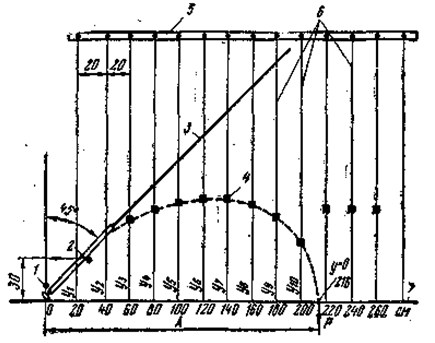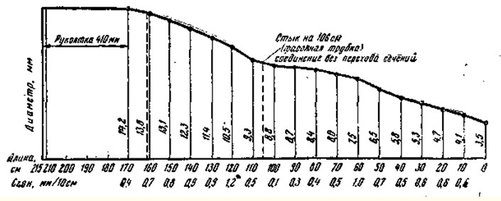 Рис. 7. Форма одноручного пустотелого удилища из стеклопластика (вес 225 г.) Строй удилища характеризует кривая его изгиба. Чтобы получить такую кривую, пользуются общепринятым методом. Удилище устанавливают под углом 45° к горизонтали и закрепляют рукоятку в нижней части. На уровне комеля натягивают горизонтально бечеву и проверяют по уровню или ватерпасу. К концу удилища подвешивают груз, который постепенно увеличивают, и доводят конец удилища до горизонтали. Вес этого груза необходимо записать, он называется испытательной, нагрузкой. Чтобы зафиксировать кривую изгиба, а затем вычертить ее в масштабе на бумаге, начиная от комеля и двигаясь по горизонтали, измеряют через каждый 20 см высоту кривой (от удилища до горизонтали). Затем измеряют длину основания кривой от комеля до вершины. Для выполнения этой работы сооружают несложный стенд (рис. 8). На стене от потолка до пола натягивают вертикально отрезки лески или нитки, располагая их в 20 см одну от другой. На них с помощью иглы надевают резиновые кубики (0,5 см3). Передвигая и устанавливая кубики, против удилища фиксируют кривую изгиба, удилище освобождают от груза.