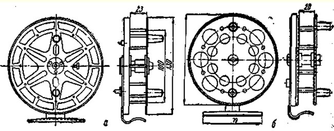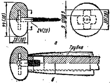 Рис. 13. Резиновые грибки: а — с шурупом, б — с винтом (размеры: в скобках — для одноручного удилища, без скобок — для двуручного) Значительно лучше, когда вместо шурупа к крестовине приваривают короткий винт, который ввертывают в металлическое дно трубки, имеющей отверстие с нарезкой. Трубку плотно насаживают на комель удилища, на пробковый слой ставят металлический оконцеватель (рис. 13, б). КатушкодержателиКатушкодержатели служат для крепления катушки на рукоятке удилища. Они бывают передвижные, позволяющие крепить катушку в любом месте (см. рис. 12, а, г) и встроенные в рукоятку, с постоянным местом крепления катушки (см. рис. 12, б, в). Простейшими передвижными катушкодержателями служат два металлических кольца, похожих на усеченный конус, у которого диаметр одного основания больше другого на 1,5–2 мм. Меньший диаметр берут по диаметру рукоятки. Кольца надвигают расширенной стороной на лапки катушки и плотно зажимают. Иногда вместо конусных колец применяют плотнопередвигающиеся по рукоятке цилиндрические кольца с выступающими гнездами для лапок катушки. Для плотной затяжки лапок кольца должны пружинить, поэтому их лучше изготовлять из тонкой нагартованной латуни с толщиной стенок не более 0,6 мм. Еще более надежно крепится катушка, когда один из держателей сделан с винтовым зажимом, а другой — цилиндрический с гнездом (см. рис. 12, д). Пропускные кольцаПропускные кольца должны быть легкими, прочными, стойкими на истирание, полированными. Лучшими считаются агатовые в металлической оправе и стальные хромированные. Оправу концевого кольца лучше делать в форме «тюльпана». Такая форма предохраняет леску от захлестывания за конец удилища (рис. 14).