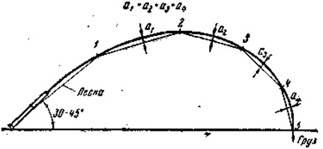 Рис. 8. Стенд для снятия кривой изгиба удилища: 1, 2 — опоры для закрепления рукоятки, 3, 4 — начальное и конечное положение удилища, 5 — рейка, в — капроновые жилки с резиновыми кубиками, 7 — горизонталь (бечева); Р =- испытательная нагрузка Анализируя кривые, мы убеждаемся, что каждое удилище имеет свою форму изгиба, которая характеризует его строй. Если сравнить кривые изгиба двух удилищ конусной формы, у которых длина и толщина верхних концов одинаковая, а диаметры комелей разные, то у более комелистого удилища максимальная высота кривой сдвинута ближе к вершине, а у прогонистого удилища (менее комелистого) она расположена дальше от вершины (рис. 9). При равной упругости груз для изгиба комелистого удилища потребуется больший, чем для прогонистого.