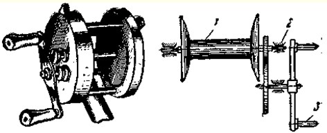 Рис. 20. Катушка-мультипликатор: 1 — шпулька, 2 — подшипник, 3 — ручка Одним из видов инерционных катушек являются мультипликаторы (рис. 20). Барабан у них закреплен неподвижно на оси, концы которой упираются в две боковые щечки, установленные на общем основании. Ось вращается в концевых подшипниках, а вместе с ней и барабан (шпулька). Ось и рукоятка соединены зубчатой передачей; при одном обороте рукоятки барабан делает 3–3,5 оборота. Такая конструкция позволяет сократить габариты катушки, предельно облегчить ходовую часть шпульки, например выполнить ее на центрах подобно часовому механизму. Недостаток этих катушек — слишком малый диаметр намотки шпульки. У хороших катушек диаметр намотки увеличен наращиванием пробки; ручки сделаны выключающимися при забросе, ось шпульки стоит на часовых камнях; катушка снабжена лесоукладывателем и двумя видами тормозов: глухим (регулируемым) в тормозом-трещоткой (нерегулируемым). Такая катушка позволяет делать далекие забросы, легка и удобна в обращении.