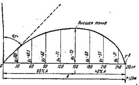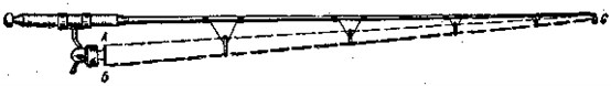 Рис. 10. Идеальная кривая изгиба удилища длиной 3,14 м Удилище с хорошим строем имеет плавную кривую изгиба от вершины до комеля (включая рукоятку) без резких перегибов и без прямых участков. На рис. 10 дана идеальная кривая изгиба удилища длиной 3,14 м конусно-параболического строя. Как видно из рисунка, перпендикуляр, опущенный из высшей точки кривой на ее основание, делит основание на две части: 40 % длины в сторону вершины и 60 % в Сторону комеля; длина основания кривой А составляет 75–80 % всей длины удилища, включая рукоятку. Зная длину удилища и кривую его изгиба, можно построить другую подобную ей кривую и для удилища другой длины. Сравнивать кривые изгиба удилищ можно в том «случае, когда их длины равны. Таким образом, строй любого удилища можно сравнить с идеальным строем, пользуясь кривыми изгиба. Мощность удилищаУдилище, как всякая пружина, может быть более сильным (мощным) и менее сильным: все зависит от его упругости и жесткости. Комелистое упругое удилище более жесткое, поэтому оно более мощное, чем упругое прогонистое. При равноценной упругости мерой мощности удилищ может служить величина испытательной нагрузки, изгибающей конец удилища до горизонтали (при установке под углом 45°), Для спиннинговых удилищ, не считая особо мощных, вес этого груза лежит в пределах от 0,8 до 1,8 кг. Удилищем с хорошим строем можно без труда вываживать рыбу весом в 10 раз больше его испытательной нагрузки. Теперь представим себе два удилища одинаковой длины, кривые изгиба у них совпадают, а мощности разные. Или два удилища разной длины, разной мощности, кривые изгиба которых подобны. Можно ли считать, что удилища в таких случаях имеют одинаковый строй? Вероятно, строй их следует считать подобным, так как пропорциональность распределения материала по длине удилищ в том и другом случае одинаковая. К понятию о строе можно добавить еще такое свойство удилища, как «чуткость», т. е. способность его передавать от лески к руке всякие толчки извне, например игру блесны, удар грузилом о дно, траву или, камни. Тонкое жесткое удилище из плотного упругого материала обладает большей чуткостью, чем толстое, сделанное из рыхлого материала. Лучшим резонатором «тонких» ощущений является полое удилище, из которого вынута сердцевина, балласт, притупляющий «чуткость». Отдельные части удилищаСпиннинговое удилище имеет соединительные трубки, рукоятку, грибок, катушкодержатель и пропускные кольца. Соединительная трубкаСоединительная трубка — очень важная и ответственная часть удилища: соединение отдельных колен должно быть плотным и таким же прочным, как все удилище в целом. Длина трубок зависит от диаметра удилища, а толщина их стенок от его мощности. Простейшим соединением колен деревянных удилищ может служить дюралюминиевая трубка. В местах, стыка колена срезают наискось, трубку плотно нагоняют на комелевый конец, а верхний конец подгоняют так, чтобы его можно было вставлять и вынимать из трубки. Длина трубки при таком соединении должна составлять не менее 8–9 диаметров удилища, а длина косого среза — 6 диаметров. Но такое соединение имеет недостаток: трудно разомкнуть колена, если дерево набухнет от воды. Удилища из стеклопластика и клееные из бамбука соединяют с помощью латунных точеных цельнотянутых трубок. На конец нижнего. колена нагоняют трубку, а на конец ве