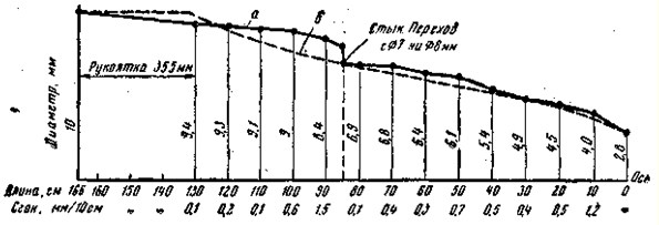 Рис. 6. Форма одноручного удилища из стеклопластика (вес 280 г): а — фактическая, б — идеальная