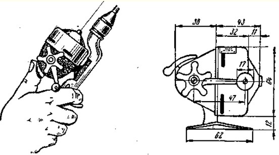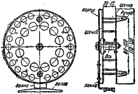 Рис. 17. Инерционная катушка. Общий вид Примечание. Все удилища с хорошим строем имеют конусно-параболическую или близкую к ней форму. Требования, предъявляемые к катушке, сводятся к следующему. Наружный диаметр барабана должен быть порядка 90 — 120 мм, диаметр намотки 70 — 100 мм, ширина между щечками 20–25 мм. Катушки меньших диаметров для ловли спиннингом непригодны. Чем меньше вес барабана, чем легче его ход, тем меньше будет его инерция, и дальше заброс. Вес барабана облегчают благодаря применению более легкого, но прочного металла (дюралюминия), уменьшению толщины щечек (до 0,8 мм), высверливанию по периферии щечек отверстий — таким образом вес доводят до 50–80 г. Отверстия, расположенные ближе к центру, мало уменьшают инерцию барабана, но делать их необходимо для создания воздушного (автоматического) торможения барабана. При этом барабан должен быть жестким и прочным.