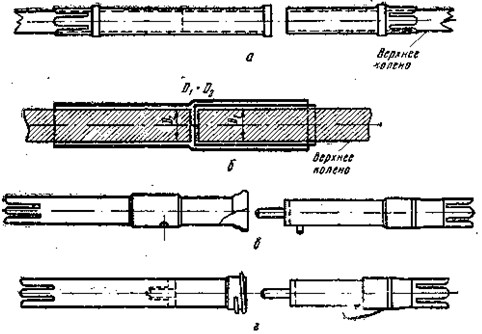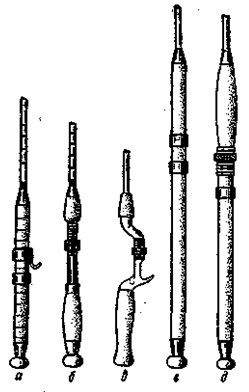 Рис. 11. Соединительные трубки: а — точеная латунная, б — фасонная стальная, в — с кнопочным запором, г — с винтовым запором Самая лучшая соединительная трубка — фасонная, сделанная из стали; она позволяет соединить концы удилища без перехода сечений на месте их стыка (рис. 11, б), что улучшает строй и надежность удилища. У импортных удилищ контртрубка на конце имеет впаячное донышко с хвостовиком, а внутри трубки посередине вставлено гнездо для хвостовика. Если хвостовик не слишком толст и хорошо центрирован с гнездом, то это целесообразно, так как усиливает место стыка. Кроме этого, трубки имеют еще винтовой или кнопочный запор (рис. 11, в, г). Трубки для соединения клееных шестигранных удилищ из бамбука должны иметь диаметр описанной окружности вокруг граней. В том месте, где насаживается трубка, на грани наклеивают тонкие пластинки из бамбука. Толщина их 0,6–0,8 мм, длина — в соответствии с длиной посадки трубок (половина длины трубки плюс длина лапок). Конец с наклеенными пластинками округляют по диаметру трубки, а нижние концы планок срезают на нет по длине лапок. Округленный конец удилища обматывают тонкой шелковой ниткой по винтовой линии в 1–2 слоя. Чтобы обмотка при насадке трубки не сползала, в 2–3 мм от торца удилища пропиливают незначительную кольцевую бороздку, которую заматывают нитками в 4–5 слоев так, чтобы она чуть возвышалась над обмоткой. Обмотку покрывают 1 или 2 раза шеллачным лаком и, когда он просохнет, трубку нагревают и насаживают. Контртрубку насаживают без подклейки планок, но обязательно с обмоткой нитками. После насадки трубки лапки туго обматывают тонкой прочной ниткой, которая их сжимает, и они плотно охватывают нижнюю конусную часть пластинок. Такая насадка цилиндрических трубок позволяет соединять концы удилищ почти без перехода сечений (так же, как и фасонные трубки). РукояткаРукоятка служит для того, чтобы удобнее держать удилище и управлять им. Лучшей считается рукоятка, сделанная из пробочных цилиндрических колец. Смазанные клеем для кожи или казеиновым клеем, плотно надетые на комель удилища, они образуют сплошной цилиндр диаметром 30–35 мм. После обработки диаметр рукоятки делают не более 25–28 мм. Длина рукоятки для одноручных удилищ составляет 300–350 мм, для двуручных — 550–700 мм. Отверстия в пробках вырезают тонкостенной металлической трубкой с острыми краями. Концы рукоятки обрамляют конусными металлическими кольцами или оконцевателями из пластмасс. Форма рукояток бывает различной (рис. 12).
