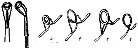 Рис. 14. Концевые (слева) и пропускные кольца: а, б — для удилищ с инерционной катушкой; в, г — для удилищ с безынерционной катушкой Для ловли с инерционной катушкой применяют набор колец с внутренним диаметром от 5 до 10 мм. На удилище их располагают в порядке уменьшения диаметров от комеля к концу. Диаметр концевого кольца берется на 0,5–1 мм больше диаметра предыдущего кольца. Для крепления колец на удилище применяют проволочную мостовую оправу с лапками, которые приматывают нитками к удилищу. Высоту центров пропускных колец регулируют высотой мостовой оправы. Диаметр колец для ловли с безынерционной катушкой подбирают в зависимости от длины удилища и диаметра шпульки катушки (рис. 15). Первые от катушки 2–3 кольца довольно большие (диаметром 30–40 мм), поэтому их удобнее делать съемными или складными.