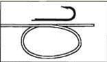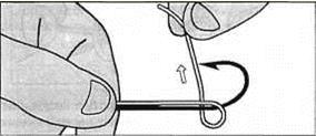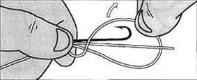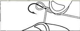 Рис.6. Сложите из лески петлю, оставив рабочий конец 10-12 см длины. Приложите крючок к вершине петли так, чтобы цевье было параллельно основной лесе. Зажмите пальцами.