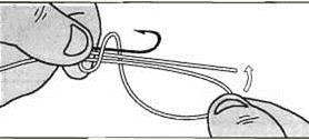В большинстве случаев крючки с лопаточкой применяются маленьких номеров, поэтому узел на них не так-то просто сделать. При вязке узлов витки лески на цевье крючка должны ложиться ровными и плотными рядами, без заскакивания одного витка на другой. Важно помнить, что после затягивания узла леска должна находиться с внутренней стороны поддева, таким образом, цевье крючка будет как бы продолжением лески. Рекомендуется после успешного завязывания узла нанести на последний немного водостойкого клея (типа «Момент»). Петельный узел с наружным пропуском конца лески