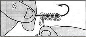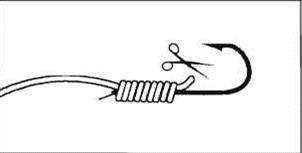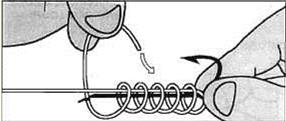 Рис.2. Обмотайте рабочим концом цевье крючка и леску 8-10 раз, не сильно натягивая последнюю, но стараясь, чтобы витки не заскакивали один на другой.