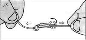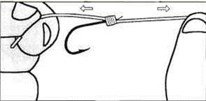 Рис.16. Смочив узел слюной, потяните леску за концы в противоположные стороны.
