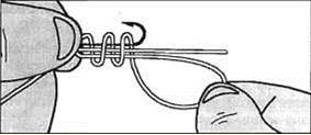 Рис.13. Зажав пальцами основание петли и головку крючка, одной стороной петли начинайте обмотку цевья, основной лески и другой стороны петли, пропуская при каждом обороте свободный кончик через петлю.