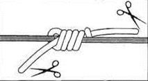 5. Обрежьте излишки стопорной лески, оставив по 1,5-2 см на концах. Эти торчащие концы не помешают прохождению узла через пропускные кольца удилища, но зато за них можно подтягивать стопорный узел, если он ослабнет при перемещении его по основной леске. Обычно величина диаметра лески, пригодной для вязки стопорного узла, должна быть такой же, как у основной лески, или чуть больше. Хороша флуоресцентная леска для стопора - ее лучше видно. Стопор с использованием узла типа «Данкэн»