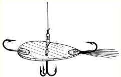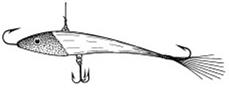 Рис. 3. Балансир, по форме напоминающий разрез крыла самолета Самодельные оловянные балансиры лучше не покрывать краской. Естественный цвет металла больше привлекает щуку. Тройник снизу ставить не следует – он ухудшает игру. Вместо этого в задней части балансира устанавливается двойной крючок, а в головной – одинарный. Номера крючков 1–4. Вместо задней лопасти-хвоста на оловянных балансирах я монтирую колонковый хвостик. Он препятствует попятному движению балансира и служит для его разворота головой вперед при обратном ходе. Ловля на балансир вблизи установленных жерлиц заставляет щуку идти на исходящие колебания. В данном случае она быстрее наталкивается на живца. Уловистый балансир уходит в сторону, опираясь на всю площадь своего основания без заныривания головной частью. Ловля ночьюКак уже было сказано, ночью ловятся самые крупные щуки. А они не очень склонны к перемещениям и держатся в излюбленных зонах. Поэтому, чтобы ловить целенаправленно трофейную щуку, нужно устанавливать жерлицы на точках, зафиксированных по GPS. Распределяют их в зоне ловли равномерно по площади, учитывая рельеф. Так, если есть бровка, жерлицы устанавливают вдоль нее на разных глубинах. А если есть подводная возвышенность, жерлицы устанавливают по ее верхнему периметру. Время выхода щуки на ночную охоту зависит от особенностей водоема и толщины льда, но замечено, что на многих озерах и водохранилищах в январе – феврале щука клюет чаще всего за 1–1,5 часа до рассвета. Реже она выходит покормиться после полуночи (с 1 до 4 часов). Предрассветная активность зубастой связана, очевидно, с тем, что, чувствуя наступление нового дня, рыбешки начинают шевелиться. А в своих ночных поисках зубастая ориентируется исключительно на исходящие от объекта колебания. В связи с этим неплохо заранее, еще с вечера, сверлить дополнительную лунку возле каждой установленной жерлицы и за 1–2 часа до рассвета обходить их с балансиром. Но игра балансира должна быть очень деликатной. Подняв его на высоту 50–70 см, нужно делать минимальные по высоте взмахи – от 5 до 15 см. Поиграв приманкой минут десять в одной лунке, переходят к другой, к третьей и т. д. Потом начинают проход по лункам по новому кругу. Тактика повторных проходов по лункам неслучайна. Щука может подойти на исходящие от балансира колебания, но не брать ни живца, ни балансир. Живец ночью ведет себя очень пассивно, а игра даже хорошего балансира матерую щуку может насторожить. Если продолжить игру, щука почувствует подвох и отойдет, но кратковременная игра с большим интервалом удержит ее вблизи живца. Щука на «чертика»Но бывает, что щука настолько пассивная и вялая, что она не хочет брать ни на живца, ни на балансир даже днем. В таких случаях я начинаю ловить на безнасадочного «чертика» другую рыбу. И как ни странно, в такие периоды на игру мизерной приманки мне не раз попадалась щука. Я не раз задавал себе вопрос: почему это происходит? Ну ладно, мелкие щурята попадаются на мормышку. Это понятно. Они в таком возрасте питаются еще личинками, червячками и прочей живностью. Но взрослая щука питается исключительно рыбой, особенно зимой. В моем представлении, это происходит вот почему. Любая рыба реагирует в воде на движущийся объект, улавливая исходящие от него волны. Если объект большой, рыба, в том числе и хищная щука, чувств