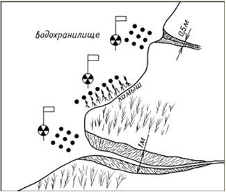 Рис. 4. Оптимальная расстановка жерлиц в местах с явно выраженным донным рельефом и возле камыша При отсутствии клева полезно рядом с жерлицами делать пробежки. Иногда я прохаживаюсь вдоль ряда жерлиц с периодическим достаточно сильным потопыванием по льду. Например, совершаешь осторожный проход и вдруг – топнешь ногой посередине между двумя жерлицами. Очень часто в результате моих стараний клев зубастой оживает. Я это связываю со слабой активностью малька и щуки. При топоте неподвижно стоявший малек резко веером рассыпается в стороны, мелькают серебром бока рыбок, и это раззадоривает щуку, она начинает охоту и наталкивается на приманку жерлицы. Живец, водоросли, грунтУ щуки на мелководье любимая пища окунь-травянник, и ловить ее желательно на эту наживку. Ихтиологи сделали вывод, что окунь составляет 70 % рациона щуки. Это самый привычный для нее живец, и водится он практически в любом водоеме. Еще окунь хорош тем, что очень живуч. Окунь быстрее, чем любой другой живец, адаптируется к новым условиям. Скажем, по первому льду он начинает клевать (как говорят рыболовы, шевелиться) раньше других рыб, тогда как, например, плотве для адаптации нужно около двух недель. А вообще окуня на мелководье можно обнаружить в течение всей зимы, он просто при неблагоприятных условиях бывает малоподвижен. Плотва для щуки тоже хорошая наживка, но она менее живучая. Плотва может быстро заснуть, если ее наловили на глубине, а жерлицы ставят на мели. Так как стаи мелких окуней предпочитают держаться на твердом песчаном, глинистом или гравийном грунте, то при поиске подходящих зон для жерличной ловли нужно ориентироваться на участки обнаженного берегового грунта, уходящего под лед. Понятно, если берег заболоченный, то возле него окунь держаться навряд ли будет. Также ориентиром для установки жерлиц могут служить выходы водорослей. В начале зимы окунек любит обитать возле рогоза, тростника, хвоща. Если водоросли располагаются возле заметного течения, малек может обитать возле них всю зиму. Бытует мнение, что для ловли щуки универсальным живцом является ротан. Но это не так. В тех водоемах, где ротана много, там он бывает на тройнике незаменим, поскольку очень живуч, подвижен и щуке по вкусу. Но вот пример. Раньше на реке Пахре зубастую ловили только на ротана. Ловили, правда, по открытой воде на поплавочные снасти впроплыв. Но потом щука выела эту рыбу, и теперь она на ротана не берет. Также многие считают, что пескарь – самый лучший живец для щуки и судака. Но опять же это там, где его много. Если пескаря в водоеме нет, то привозного щука может проигнорировать. Она соблазнится им только в случае максимального жора. Выбирая живца для ловли, нужно отдавать предпочтение тому, который выловлен из водоема, на котором вы будете устанавливать жерлицы, поскольку привозной живец может отдавать посторонним запахом. Обоняние у щуки чуткое. Тонкости оснасткиНа подмосковных водохранилищах, где сильный рыболовный прессинг, щука очень осторожна, поэтому оснастке нужно уделять особое внимание. Если хищница берет очень вяло, нужно полностью отказаться от грузила. При этом живца наживляют самого бойкого – тогда он быстро устремится вниз и сам найдет оптимальный уровень обитания. Если все же живец не справляется с толстой леской, его можно опустить на дно с помощью рогатк