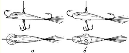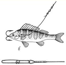 Рис. 5. Способ насаживания живца с удлиненной пристежкой: а – пристежка; б – живец на двойном крючке Мне нравится ловить щуку на жерлицы в затяжную оттепель. Рыбалка становится активной, и если правильно угадал с местом установки жерлиц, обязательно будешь с уловом. И не забывайте, что ловля в оттепель успешна в течение всей зимы. (А.Г. Горяйнов) | |