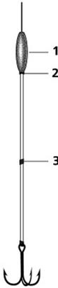 Рис. 6. Поводок из сдвоенной монолески: 1 – грузило; 2 – стопор; 3 – нитяная обмотка В холодную погоду нежелательно долго возиться с насаживанием живца (будь то окунек, ершик, плотвичка или карасик): переохлажденная рыбка может подо льдом быстро уснуть, и вы напрасно будете ждать поклевки. Обычно я применяю два сравнительно быстрых и удобных способа насаживания. Первый: поводок протягиваю через рот живца за жаберную крышку и креплю к основной леске либо через карабинчик, либо способом «петля в петлю» (при слабом клеве). Второй: живца подцепляю за спинку, в основании верхнего плавника, одним из крючков тройника или двойника. При этом жало крючка нужно вводить осторожно, чтобы не повредить рыбке позвоночник. В неглубоких местах живец может находиться на любом горизонте: от нижней кромки льда до верхушек подводных зарослей. Обязательно старайтесь держать приманку немного в стороне или над зарослями, иначе рыбка может просто-напросто спрятаться в них и вы напрасно будете ждать поклевки. В то же время живец, упорно пытающийся достичь травяного укрытия, – неплохой претендент на роль жертвы. И еще. Никогда не устанавливайте свои жерлицы слишком близко к чужим. Да и свои надо устанавливать таким образом, чтобы севшая на крючок рыба не запутала лески. (В.А. Казанцев) | |