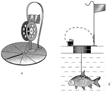 Рис. 5. Заряженная жерлица на дюралюминиевой стойке Катушку к алюминиевому рычажку и сам рычажок крепят к стойке с помощью болтов, гаек и контргаек. При сборке и разборке жерлицы нужна отвертка. Флажок лучше делать из красной или черной ткани, по возможности не впитывающей влагу. Эта жерлица имеет тот недостаток, что по последнему льду, когда пригревает солнце, металлическая стойка заваливается на сторону, поскольку лед у ее основания быстро тает. Поэтому весной имеет смысл заменить металлическую стойку на деревянную. Теперь об оснастке. Обычно я оснащаю жерлицы монолеской диаметром 0,30—0,45 мм. Универсальной считается прозрачная мононить, но иногда целесообразнее ставить зеленую, серую и даже черную. Выбор лески зависит от степени освещенности воды подо льдом, а также от наличия водных растений (по первому льду). Как известно, лески бывают мягкие и жесткие. Какая из них лучше? На мой взгляд, и та и другая имеют свои плюсы и минусы. Мягкая лучше амортизирует в процессе вываживания, но слабее в соприкосновении со щучьими зубами. Жесткая меньше путается на льду, особенно в сильный ветер. Из сдвоенной такой мононити я обычно делаю поводки, которые заменяют мне металлические. О металлическом поводке следует сказать особо. То, что он отпугивает хищную рыбу, – вне всякого сомнения. Поэтому желательно, чтобы многожильный стальной сердечник был в мягкой оплетке. Длина поводка 25–30 см, применять его уместнее всего во время активного щучьего жора, что зимой случается редко. И мне кажется, не стоит пугать начинающих жерличников, что щука только тем и занимается, что перекусывает леску. По моим данным, это случается лишь при слишком резкой подсечке, а также форсированном вываживании. Но в том-то и заключается искусство охоты за щукой, чтобы вызвать ее на хватку, грамотно подсечь и не тащить напролом в лунку. Почему я об этом говорю? Да хотя бы потому, что в моей практике (а жерлицами я ловлю почти 30 лет) обрывы поводка из сдвоенной мононити случались лишь по моей собственной вине (например, когда я ставил на поводки непроверенную старую леску). И таких случаев было не так много. Но, когда я оказывался на льду по соседству с жерличником, который применял в оснастке металлический поводок, мой улов, как правило, процентов на 70–80 превышал его добычу. Одни рыболовы выше поводка устанавливают скользящее грузило типа «оливки», другие предпочитают глухое крепление. На мой взгляд, при подсечке и вываживании практичнее второй вариант. Однако не стоит увлекаться грузилами большого веса – это быстро утомляет живца, он теряет подвижность и в конце концов просто замирает в 30–50 см от дна. А хищник, как известно, агрессивнее реагирует на резвую рыбку. Как видим, устройство зимней жерлицы предельно просто. Но и тут имеются свои секреты. При выборе той или иной конструкции прежде всего нужно обратить внимание на следующие основные параметры: 1. Диаметр катушки должен быть достаточно большим. Хорошая катушка не имеет поперечного люфта при вращении, предотвращает образование «парика» после резкой поклевки и обеспечивает максимально свободный сход лески во время движения хищника с живцом в пасти. Зная, сколько сантиметров в одном обороте катушки, можно легко контролировать нужную глубину для живца, не прибегая всякий раз к помощи глубомера. 2. В морозную погоду нуж