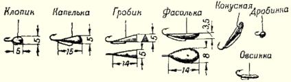 Оригинальный вид зимней ловли рыбы, ловля на мормышку, появился и получил признание не особенно давно. Он более активен, чем ловля рыбы поплавочными удочками, но требует от рыболова некоторых навыков и умелого их применения. Наименование своё этот вид ловли получил от подводного рачка-мормыша, в изобилии населяющего уральские и сибирские озера и являющегося там основным кормом рыбы. Передвигаясь небольшими толчками со дна вверх, мормыш прикрепляется ко льду, где зачастую и становится добычей рыбы. Можно предположить, что в основу способа ловли рыбы на мормышку была положена имитация движений мормыша в воде, подобно тому как зимняя блесна в какой-то мере воспроизводит движение малька или рыбки. Правда, в большинстве водоёмов, где с успехом ловят рыбу на мормышку, рачок-мормыш не водится. Видимо, мормышка привлекательна для рыбы насадкой и некоторым сходством с рыбьей молодью. На мормышку без насадки рыба берет не всегда. Мормышка — это небольшой (6-15 мм длины) грузик из олова, свинца, латуни или меди, обтекаемой формы, с крючком и сквозным отверстием для прикрепления к лесе. Формы мормышек очень разнообразны. Но имеется несколько видов, получивших у московских рыболовов наиболее широкое распространение: клопик, капелька, гробик, фасолька, дробинка, чечевичка, овсинка. Для перемещения в горизонтальном положении отверстие в мормышке, через которое она прикрепляется к лесе, несколько смещено от центра в сторону утолщённой части (рис. 1). Рис. 1. Формы мормышек Несколько отличается по конструкции уральская мормышка. Она рассчитана на перемещение в воде под углом 45°. Некоторые рыболовы считают, что на такую мормышку удобнее надевать мотыля и что она вообще больше привлекает рыбу. Форма её — конус с усечённым под 45° основанием. Сквозь вершину проходит цевьё крючка, жало крючка надзинуто на тело мормышки. У основания просверлено отверстие, через которое пропускается конец лесы, закрепляющийся обычным рыболовным узлом на цевьё крючка у вершины конуса. Изготовление такой мормышки несложно. Из тонкой пластинки любого металла (обычно медь, латунь) по шаблону следует вырезать заготовку. Одну сторону (внутреннюю) облудить. На подготовленном металлическом конусе по форме будущей мормышки заготовку обжать и придать форму конусообразной трубочки. В узкое отверстие ввести цевьё крючка и зажать так, чтобы жало и бородка разместились по длинной оси конуса. У крючка предварительно удалить кусачками лопаточку или колечко, а цевьё зачистить тонкой пилкой и смазать соляной кислотой. Подготовленную трубочку с зажатым в ней крючком взять плоскогубцами, смазать внутреннюю часть кислотой и, положив в отверстие кусочек олова, небольшим паяльником расплавить его, заполняя всю трубочку. После небольшой обработки ножом и тонкой пилкой в широком конце трубочки стальной иголкой просверлить отверстие. Интересна и несколько изменённая конусная мормышка. Отверстие проходит от центра основания конуса наклонно к внешней стороне изгиба крючка. Острие жала находится на одном уровне с вершиной конуса. Мормышка светлая — из олова или нержавеющей стали, лучше посеребрённая. Пригодна для ловли с насадкой и без насадки. Слегка изогнутый конус при перемещении способствует «игре» мормышки, мелким колебаниям, привлекающим рыбу. Практикой установлено, что больш