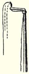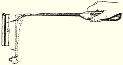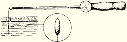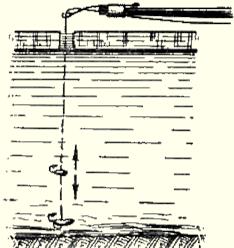 Рис. 7. Снасть с двумя мормышками На мормышку с мальком берет более крупная рыба. Нередки поклёвки щуки и судака. При ловле окуня и крупного ерша можно насаживать на крючок глаз небольшого окуня. Глазное яблоко надо надеть на крючок за белесую мускулистую ткань, не задевая зрачка. Жало крючка не закрывается. Плёнка глаза хорошо держится на крючке; при осторожном обращении можно выловить несколько рыб, не меняя насадки. Поклёвка на такую насадку всегда более энергичная и заметная. Очень хорошая насадка при ловле окуня — мелкий малёк, даже уснувший. Он прокалывается крючком в обе губки снизу и при движении мормышки кажется живым. Конечно, на живого малька ловить лучше. Его насаживают, прокалывая спинку ближе к хвостику или за нижнюю губку снизу. Малька можно законсервировать впрок в формалиновом растворе; для этого нужно слить в пол-литровую стеклянную банку две части десятипроцентного формалина и три части воды и положить мальков в полученный раствор. Через сутки мальки станут упругими. В этом же растворе, с добавлением меньшего количества воды, они могут храниться долгое время в прохладном тёмном месте. Накануне ловли нужное число мальков надо достать из банки и опустить в насыщенный раствор поваренной соли: в нём они теряют запах формалина. Отправляясь на ловлю, следует промыть мальков чистой водой и положить их в банку, коробку или чистую тряпку. Всякие искусственные насадки — «мотыль» из кусочков тонкой красной резинки, ярко-красные шерстинки, червячки из гуттаперчи и т. п. — могут применяться только в отдельных водоёмах и при хорошем клёве рыбы. По перволедью и по последнему льду практикуется ловля на мормышку с тёмной ниткой. Цевьё крючка, выходящее из мормышки, смазывается клеем БФ-2 и обматывается тёмной ниткой до образования небольшого шарика. Ближе к бородке крючка обмотка заканчивается двумя миллиметровыми усиками из той же нитки. Нитку иногда успешно заменяют маленьким кусочком тёмной микропористой резины. При ловле на такую мормышку надо, чтобы снасть мелко подёргивалась, дрожала, быстро поднимаясь вверх. Успех во многом зависит от правильно подобранной и подготовленной снасти. Зимнее удилище укорачивается до 20-25 см, леса тонкая — до 0,15 мм, мормышка подвешивается на лесу под углом 45°, «кивок» — предельно чувствительный, способный не только сигнализировать о поклёвке, но и увеличивающий частоту колебаний мормышки (например, из спиральной пружинки, свитой на конус из очень тонкой проволочки, или пружинный «кивок» конструкции В. И. Тюрина). Мормышка должна быть в форме дробинки, капельки или видоизменённая уральская с изгибом, с наклонным отверстием для подвески на лесе, светлая, из олова, припоя или посеребрённая (однако есть сведения об успешном применении и тёмных мормышек). Во всех способах ужения рыбы жало крючка должно быть острым. Дома, а иногда на водоёме его необходимо затачивать мелкой бархатной пилкой или наждачным камнем. Тупой крючок плохо входит в пасть рыбы, не прокалывает покровной ткани, на него с трудом можно насадить мотыля, который должен висеть на крючке ярко-красной кисточкой. Для определения остроты крючка жалом можно провести по поверхности ногтя. Острый крючок не будет скользить, при незначительном нажиме жало задержится на поверхности ногтя. На мормышку ловят всех рыб, которые кормятс