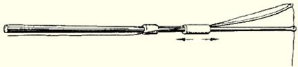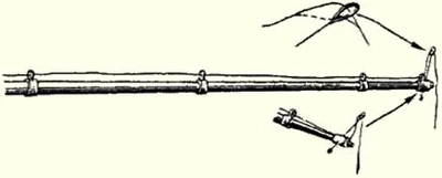 Рис. 6. «Кивок» М. Д. Камышева Погруженная мормышка не должна своим весом вытягивать лесу в прямую линию у вершины удилища. При правильно подобранном весе мормышки леса у вершины образует небольшую дужку, в центре которой находится яркий отрезок хлорвиниловой трубочки. Это устройство позволяет по малейшему изменению в положении свисающей с вершины лесы дужки определить момент поклёвки рыбы и сделать своевременную подсечку. Следует признать, что такое простое оснащение удочки для ловли рыбы на мормышку очень удобно, но требует напряжённого внимания, особенно при освоении. В дороге «кивок» не снимается с лесы, а вместе с ней осторожно закрепляется на мотовильцах. Не сложна и ловля рыбы на мормышку с поплавком. В этом случае применяют зимний поплавок, погружающийся в воду. Величина его зависит от веса мормышки. Подбирать поплавок надо с таким расчётом, чтобы он с небольшим усилием уходил под воду от тяжести мормышки. Это необходимо для того, чтобы она, опущенная на дно, была почти уравновешена грузоподъёмностью поплавка и рыбой при поклёвке почти не ощущалась. Опустив мормышку на дно, поплавок закрепляют на лесе в 2-3 см ниже поверхности воды. При ловле рыбы на мормышку с поплавком и дополнительным поводком поступают так: опускают насадку до дна и закрепляют поплавок. Это та же ловля, что и на неподвижную мормышку. Поклёвка на мормышку обозначается подъёмом поплавка вверх, поклёвка на дополнительный крючок — небольшим опусканием. Рекомендуется время от времени подёргиванием поднимать снасть ото дна на высоту до 1 м. При ловле рыбы на течении можно привязать к лесе на расстоянии 8-12 см от мормышки тонкий поводок длиной 20-25 см с мотыльным крючком и ловить и на мормышку и на мотыля. Для стоячих водоёмов поводок надо укоротить до 4-5 см и привязать его в 15-20 см от мормышки. Такое устройство снасти нередко позволяет снимать рыбу и с крючка и с мормышки. Но есть и неудобства; при вываживании крупной рыбы, попавшей на крючок с насадкой или на мормышку, свободная часть снасти иногда цепляется за нижнюю кромку льда, и рыба срывается с крючка. Поэтому при ловле на такую снасть лунки нужно делать пошире и тщательно обрубать нижнюю кромку льда. Иногда даёт хорошие результаты и ловля рыбы на две мормышки (рис. 7). На леске, над концевой мормышкой, в 15-25 см выше, крепится вторая мормышка, маленькая и лёгкая. При таком оснащении снасти леса пропускается в отверстие верхней мормышки, обёртывается вокруг одной из сторон цевья крючка и вторично протягивается через отверстие в том же направлении. После закрепления верхней мормышки обычным способом привязывается к лесе концевая. С небольшим усилием верхняя передвигается по лесе и может быть установлена на любой высоте. Место её установки определяется практическим путём в процессе ужения.